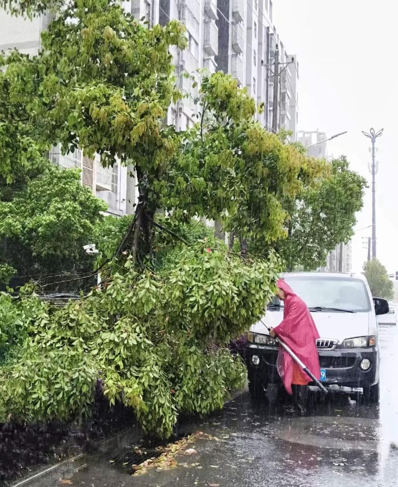 看到街上倒下的树木和周围狼藉的模样