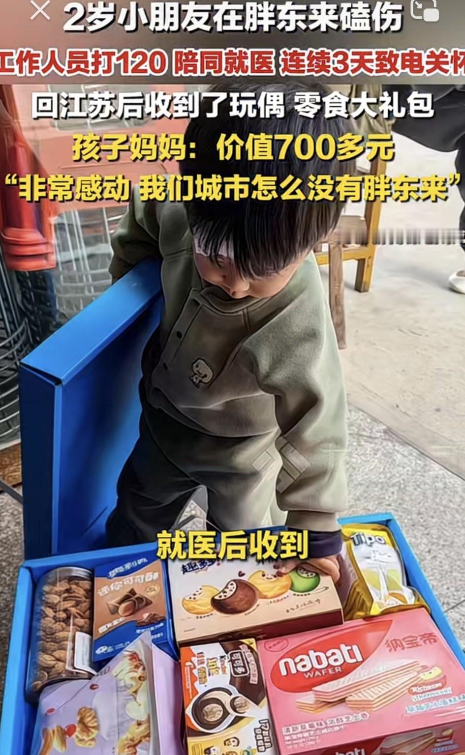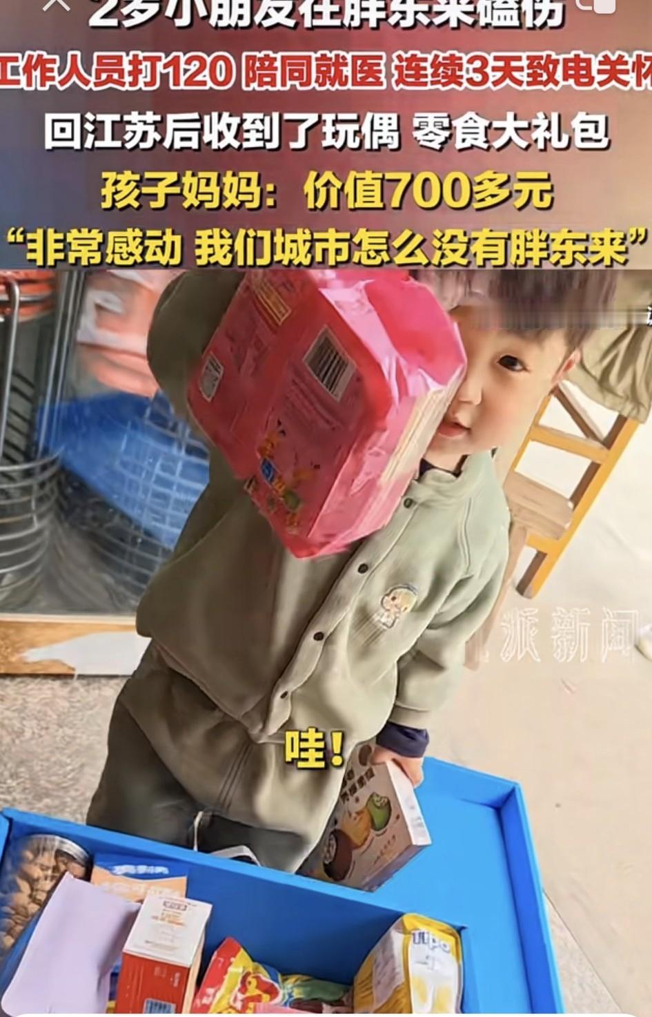 这泼流量又被抓住了!江苏2岁小朋友和家长去到胖东来购物时,不慎被磕伤后。事发之后,工作人员不但帮忙打120陪同就医,还连续3天致电关心孩子情况。更让孩子和家长惊喜的是,他们回到江苏后,竟又收到了胖东来寄来的慰问玩偶和七百块的零食大礼包。