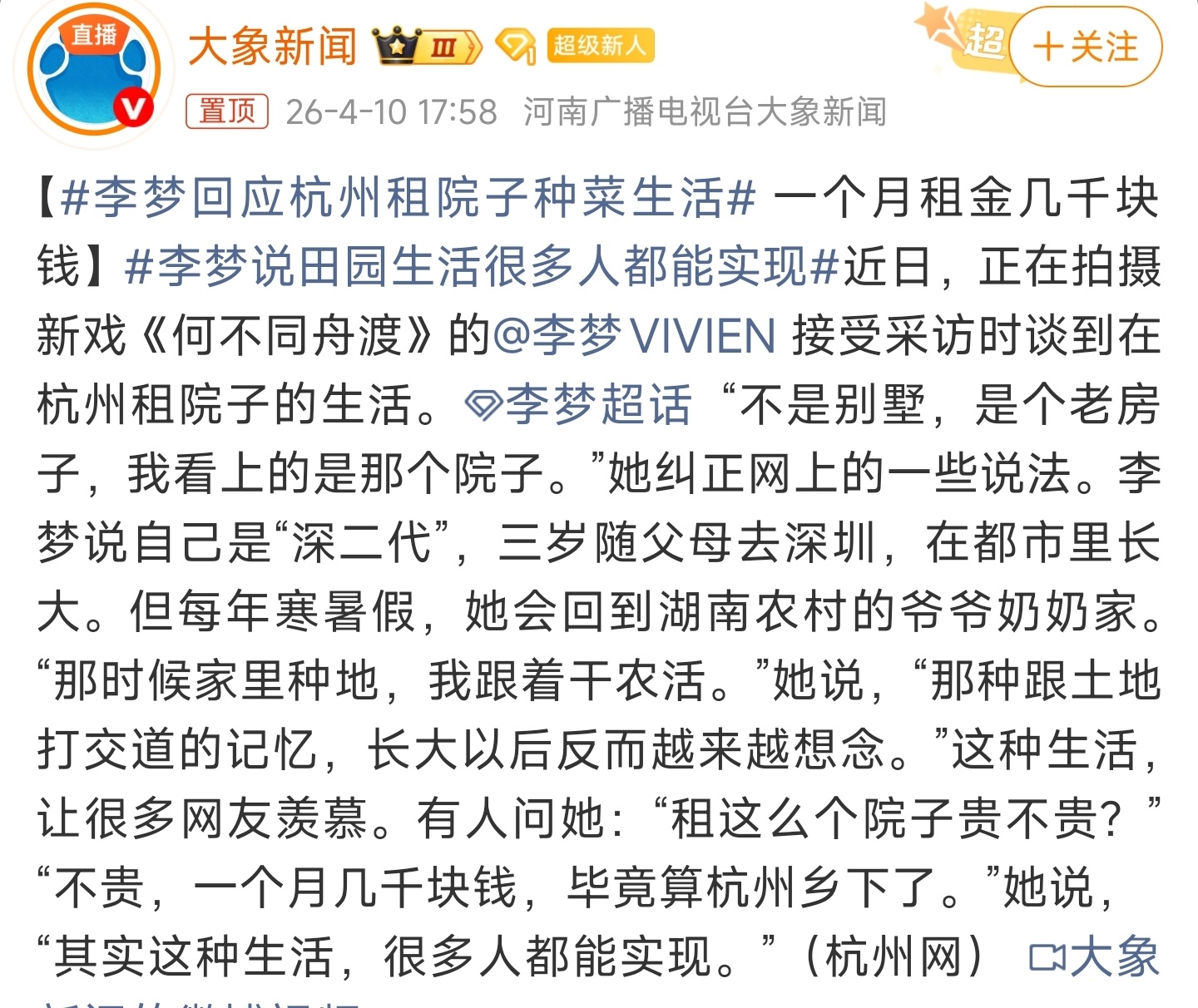 李梦回应杭州租院子种菜生活羡慕李梦的这种生活。一休息就回家有自己的空间,种种植物,治愈自己🌱。这个报道让我看见了普通人与明星之间的收入差距还是很大,普通人租几千块的房子已经算贵了,不过在艺人眼里就是便宜的。所以说那么多星二代还是要往🐟⭕挤。