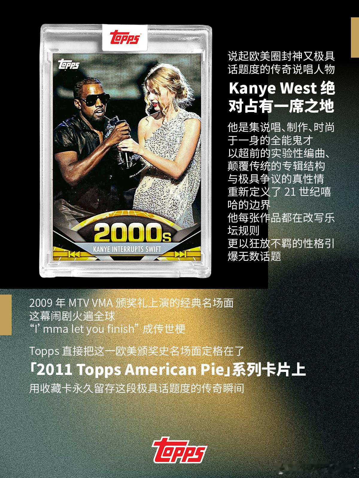 💿 2011 Topps American Pie|Kanye West 争议名场面的永恒定格说起欧美圈封神的说唱鬼才,Kanye West 绝对占有一席之地。2009 年 MTV VMA 抢麦名场面火遍全球,「I'mma let you finish」更是成了传世梗。Topps 直接把这一颁奖史名场面,定格在了「2011 Topps American Pie」系列卡片上,用收藏卡永久留存这段极具话题度的传奇瞬间。