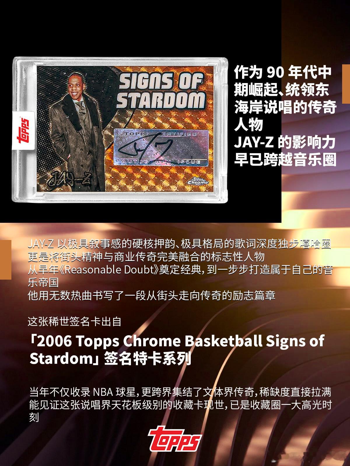 💿 2006 Topps Chrome|JAŸ-Z 东海岸说唱帝王的稀世名签作为 90 年代中期崛起、统领东海岸说唱的传奇,JAŸ-Z 早已是嘻哈界的标杆。这张稀世签名卡出自「2006 Topps Chrome Basketball Signs of Stardom」系列,当年不仅收录 NBA 球星,更跨界集结文体界传奇,直接把稀缺度拉满。从《Reasonable Doubt》到商业帝国,Topps 用一张卡,见证了这位从街头走向传奇的说唱帝王。