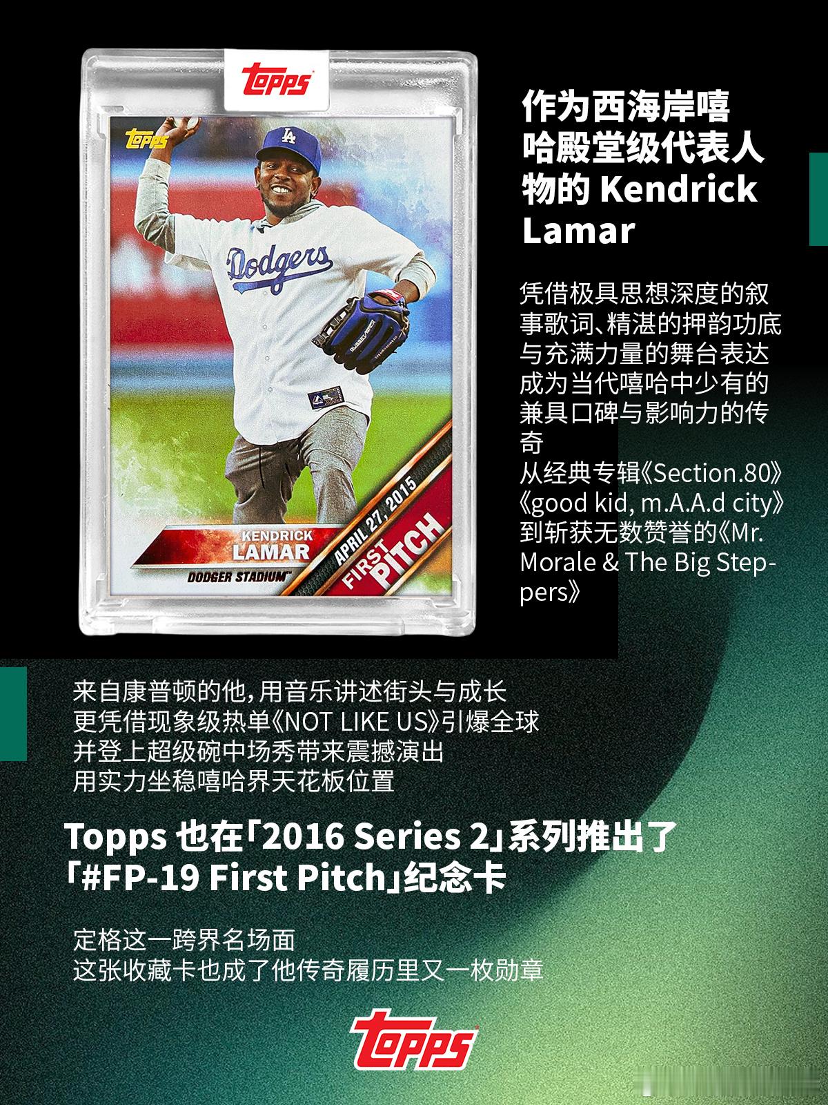 💿 2016 Topps Series 2|Kendrick Lamar 西海岸传奇的跨界名场面西海岸嘻哈殿堂级代表 Kendrick Lamar,用思想深度的歌词和炸裂舞台,坐稳了当代嘻哈天花板。Topps 在「2016 Series 2」系列,推出了这张「FP-19 First Pitch」纪念卡,定格了他为道奇队开球的跨界名场面,成为他传奇履历里的又一枚勋章。