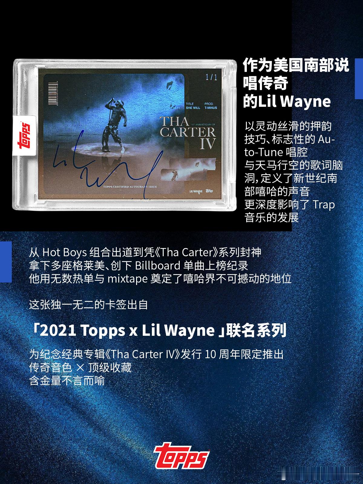💿 2021 Topps x Lil Wayne 联名|南部说唱传奇的 1/1 亲笔签作为美国南部说唱传奇,Lil Wayne 定义了新世纪南部嘻哈,更深度影响了 Trap 音乐发展。这张独一无二的 1/1 卡签,出自「2021 Topps x Lil Wayne」联名系列,为纪念经典专辑《Tha Carter IV》发行 10 周年限定推出。传奇音色 × 顶级收藏,含金量不言而喻。