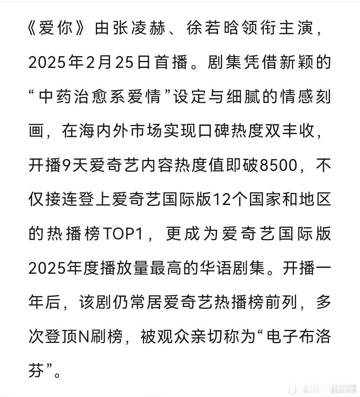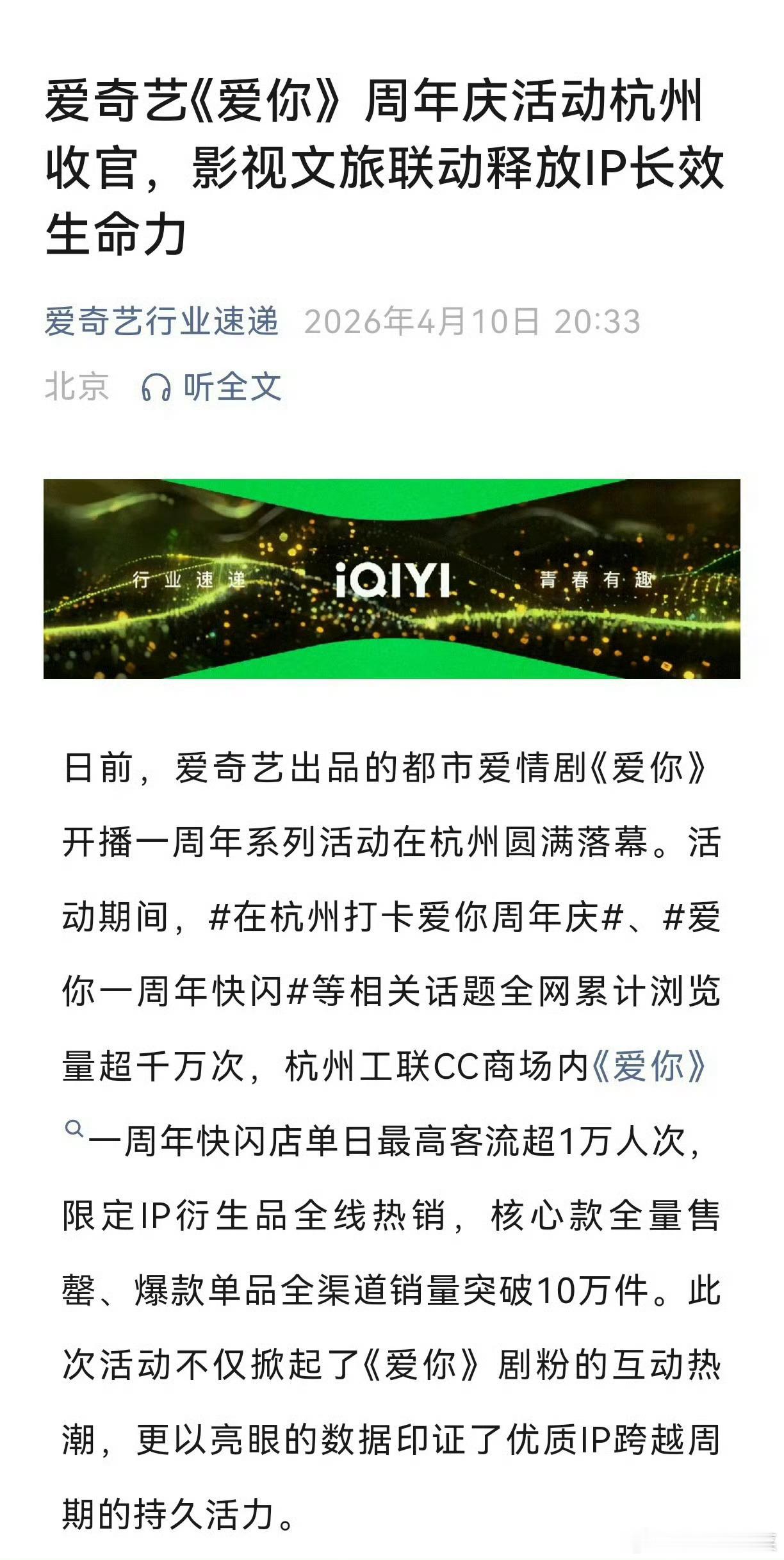 1.一周年快闪店单日最高客流超1万人次;2.“爱你一周年纪念收藏卡”现已全量售罄,剧集同款中药香囊全渠道销量突破10万件;3.开播一周年后,该剧仍常居爱奇艺热播榜前列,多次登顶N刷榜,被观众亲切称为“电子布洛芬