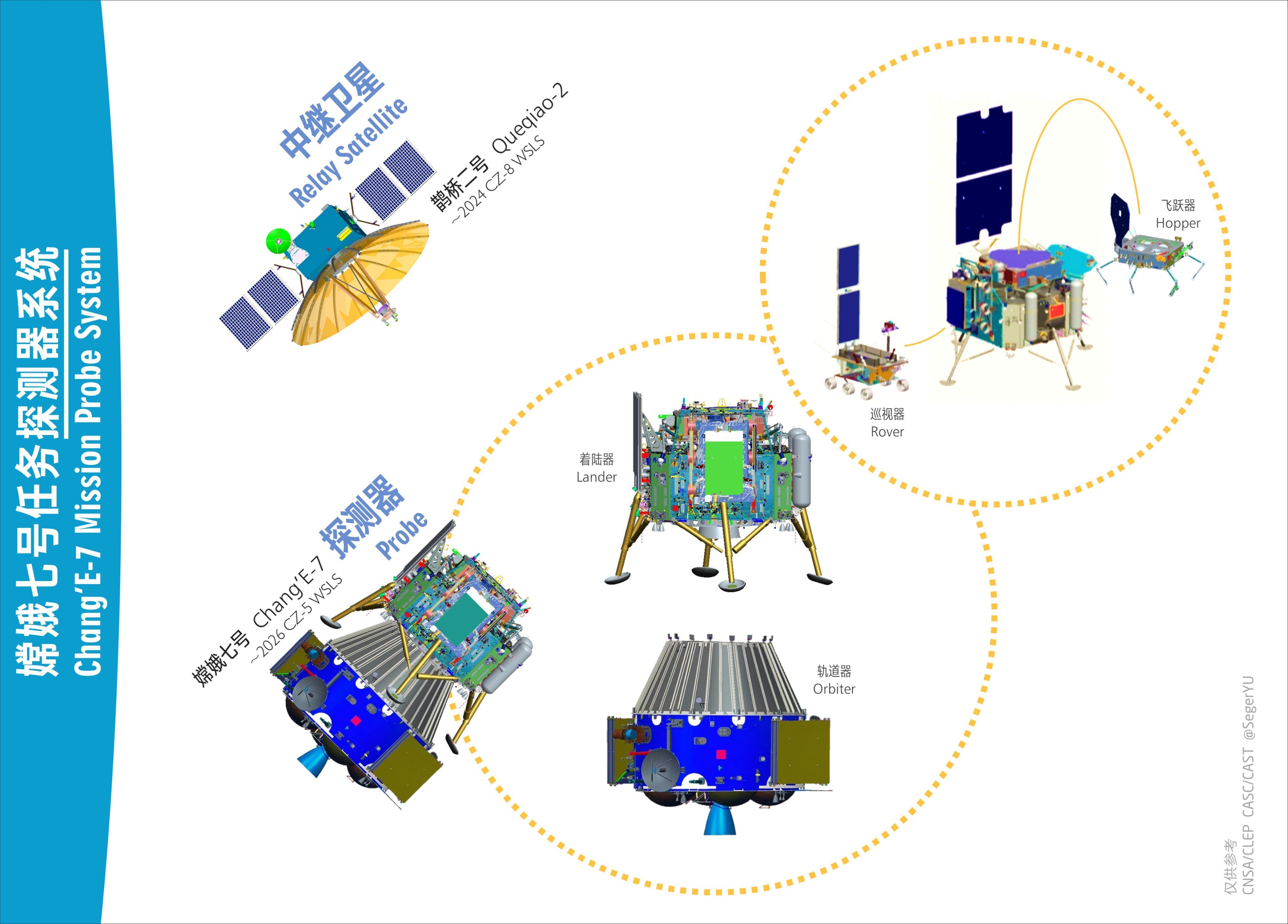 嫦娥七号月球南极环境与资源综合探测任务由着陆器+巡视器+飞跃器组成,计划于2026年8月发射。
