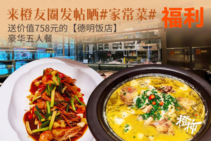 来橙友圈发帖晒#家常菜#,送价值758元的[德明饭店]豪华五人餐
