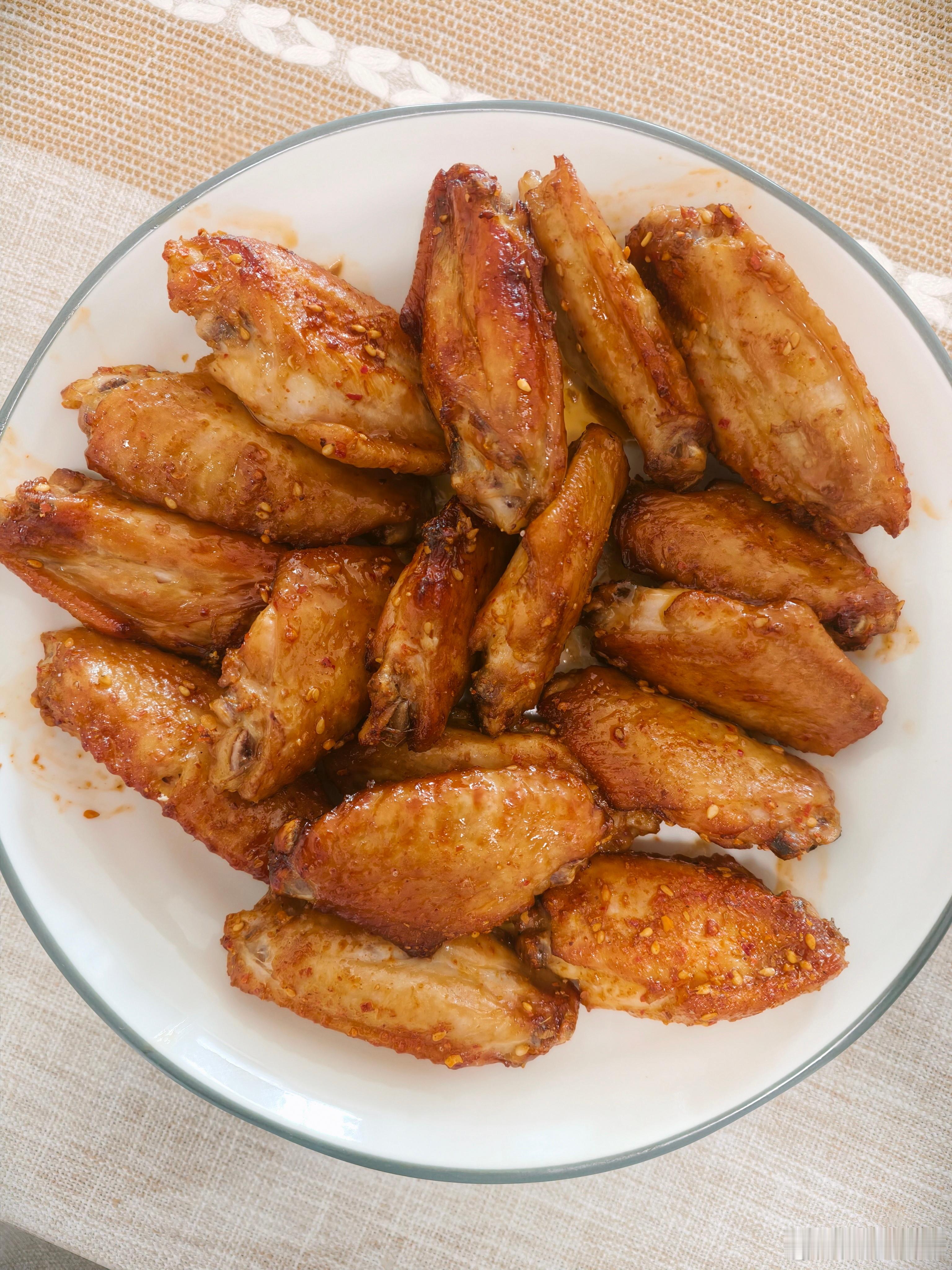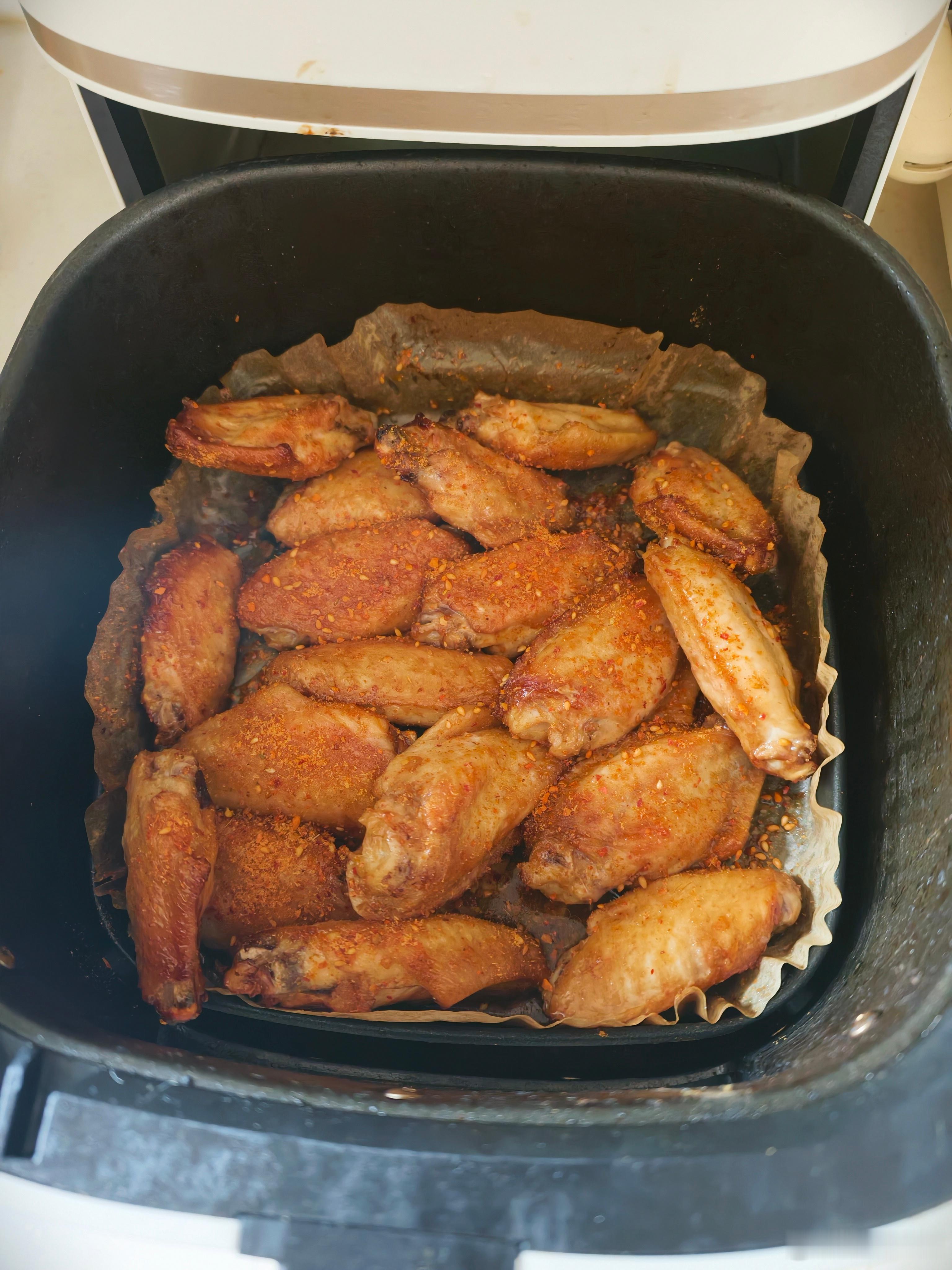 空气炸锅秘制烤鸡翅出炉,好吃简单!鸡翅洗净,倒点料酒和味极鲜稍微腌制,喷点油,放