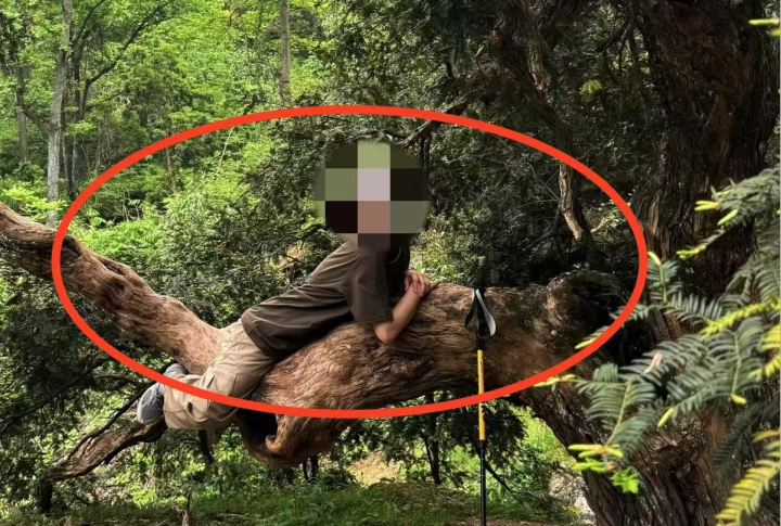 榧林山间,一些游客为了拍出所谓“出圈”的照片,不惜冒险攀爬、肆意踩踏那些静默千年的古香榧树。
