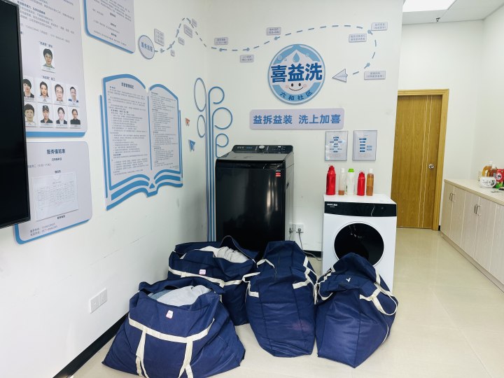 “社区腾出了10多平方米的空间,配好了工业洗衣机和烘干机,专门用来清洗窗帘。一般来说,一天就可以完成清洗和烘干,如果需要清洗的量比较大,可能就要两天时间。我们每次都会有三个人上门,两个人负责拆装窗帘,还有一个志愿者是专门提供陪伴服务的,比如和老人聊聊天,问问他们生活上还有什么需要帮助的。”