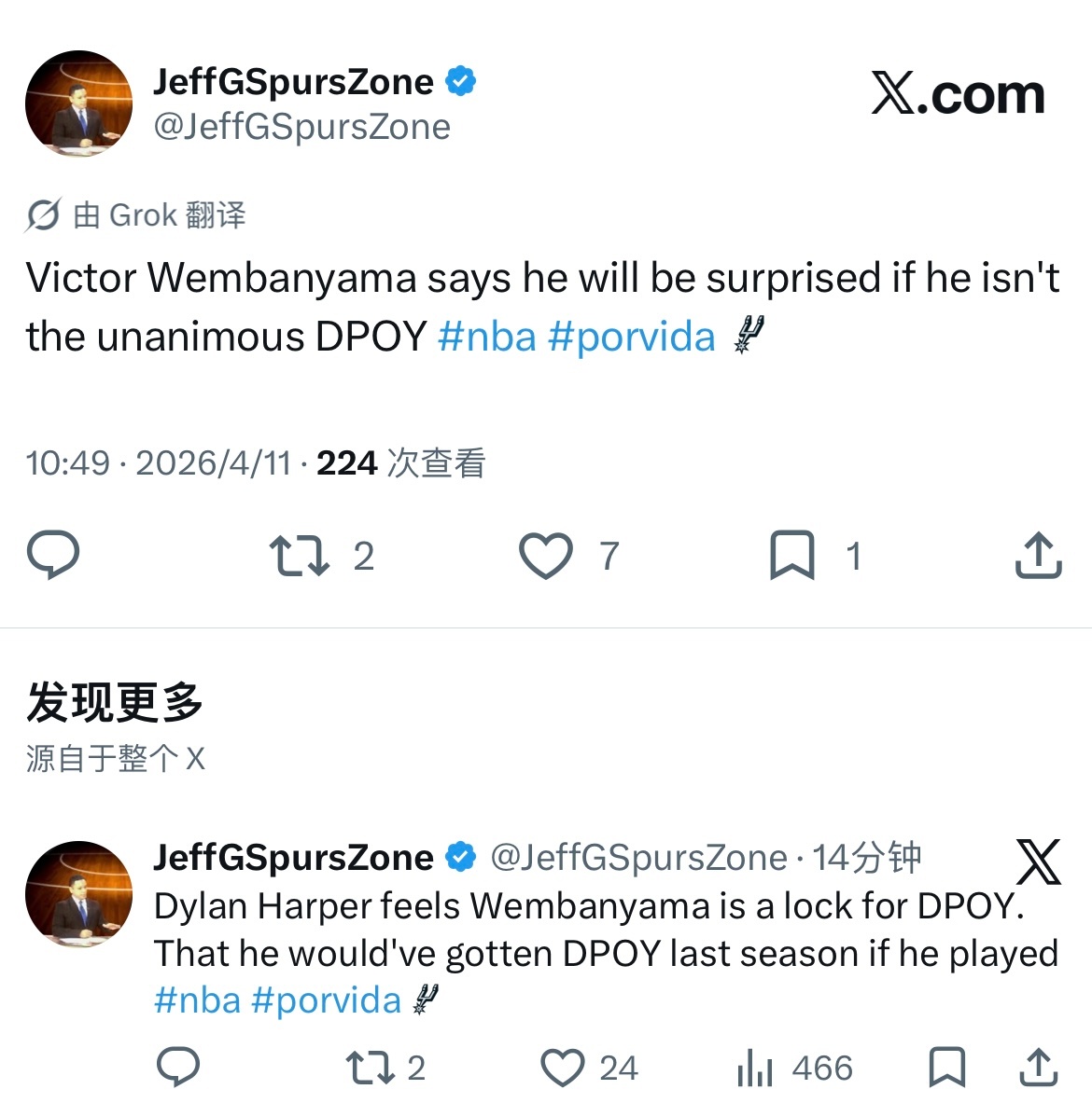 🌟队友哈珀则表示:文班当选本赛季的最佳防守球员是毫无悬念的,如果上赛季出战次数够,上赛季就已经拿到了。”
