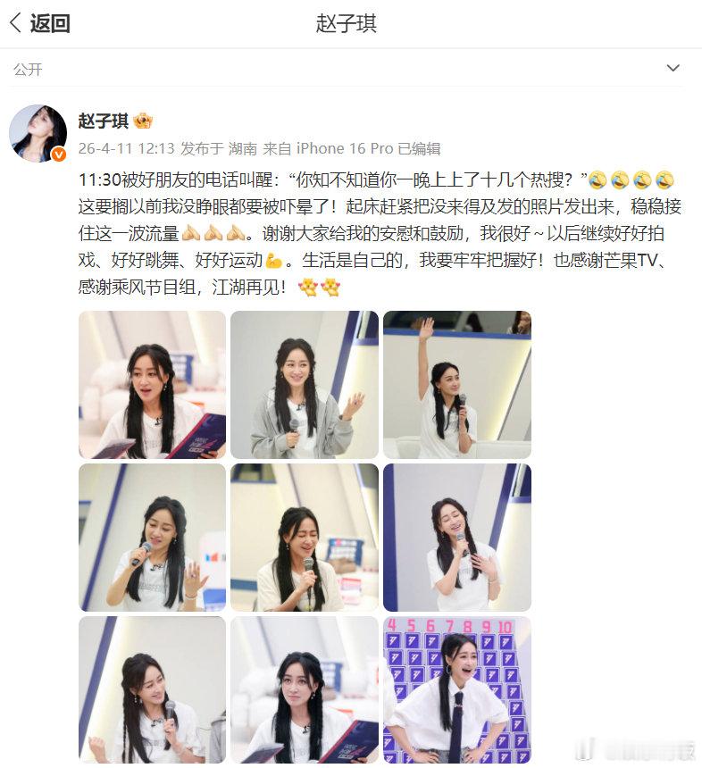 赵子琪 管他呢 近日,因在《乘风2026》一公被淘汰引发热议。4月11日,她发文回应“一夜上十几个热搜”,称被好友电话叫醒,调侃“这要搁以前我没睁眼都要被吓晕了!起床赶紧把没来得及发的照片发出来,稳稳接住这一波流量”,并感谢大家的安慰和鼓励,表示“生活是自己的,我要牢牢把握好”。同时,赵子琪也在评论区回应网友意难平的言论,说:“管他呢。”