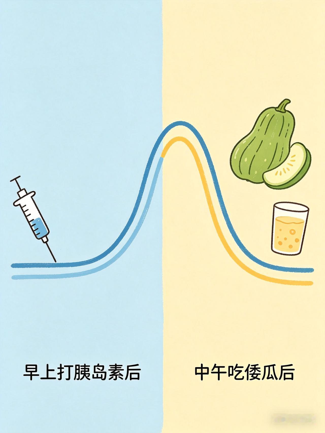 后来才明白,早上胰岛素药效到中午弱了,倭瓜升糖快,所以血糖先冲高。吃的不多,加上药还有点后劲,血糖又很快回落,真是虚惊一场。