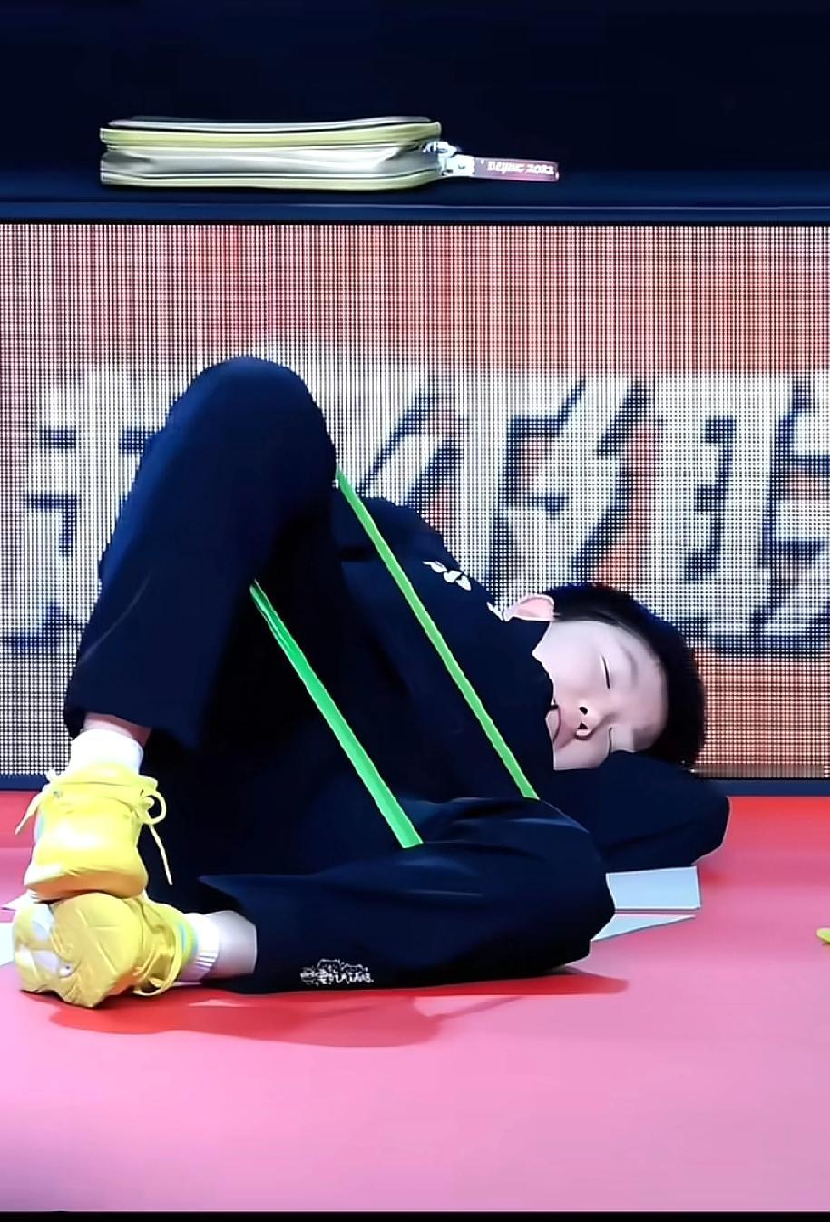 莎莎腿上还捆着弹力带就睡着了