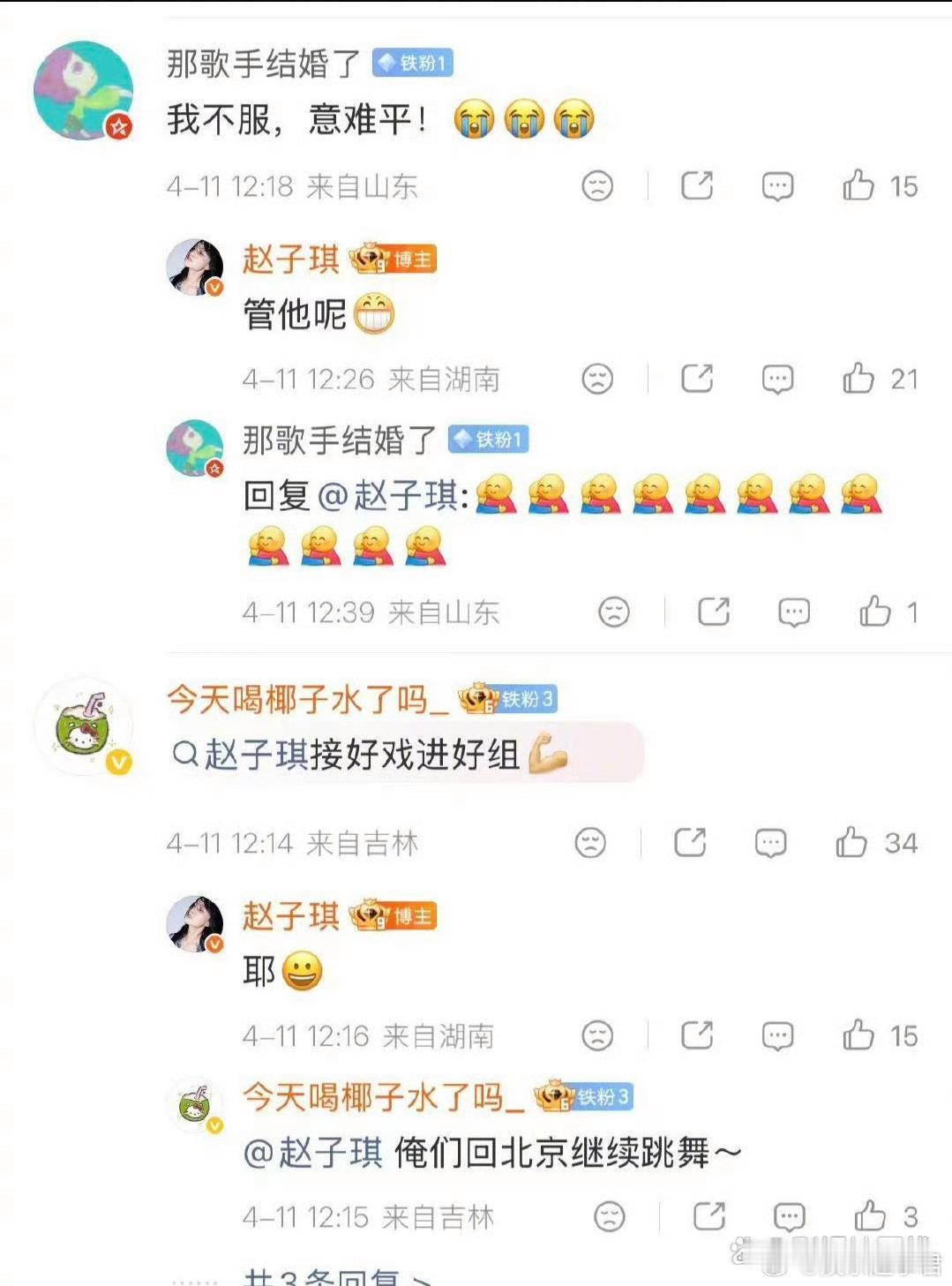 4月11日,她发文回应“一夜上十几个热搜”,称被好友电话叫醒,调侃“这要搁以前我没睁眼都要被吓晕了!起床赶紧把没来得及发的照片发出来,稳稳接住这一波流量”,并感谢大家的安慰和鼓励,表示“生活是自己的,我要牢牢把握好”。同时,赵子琪也在评论区回应网友意难平的言论,说:“管他呢。