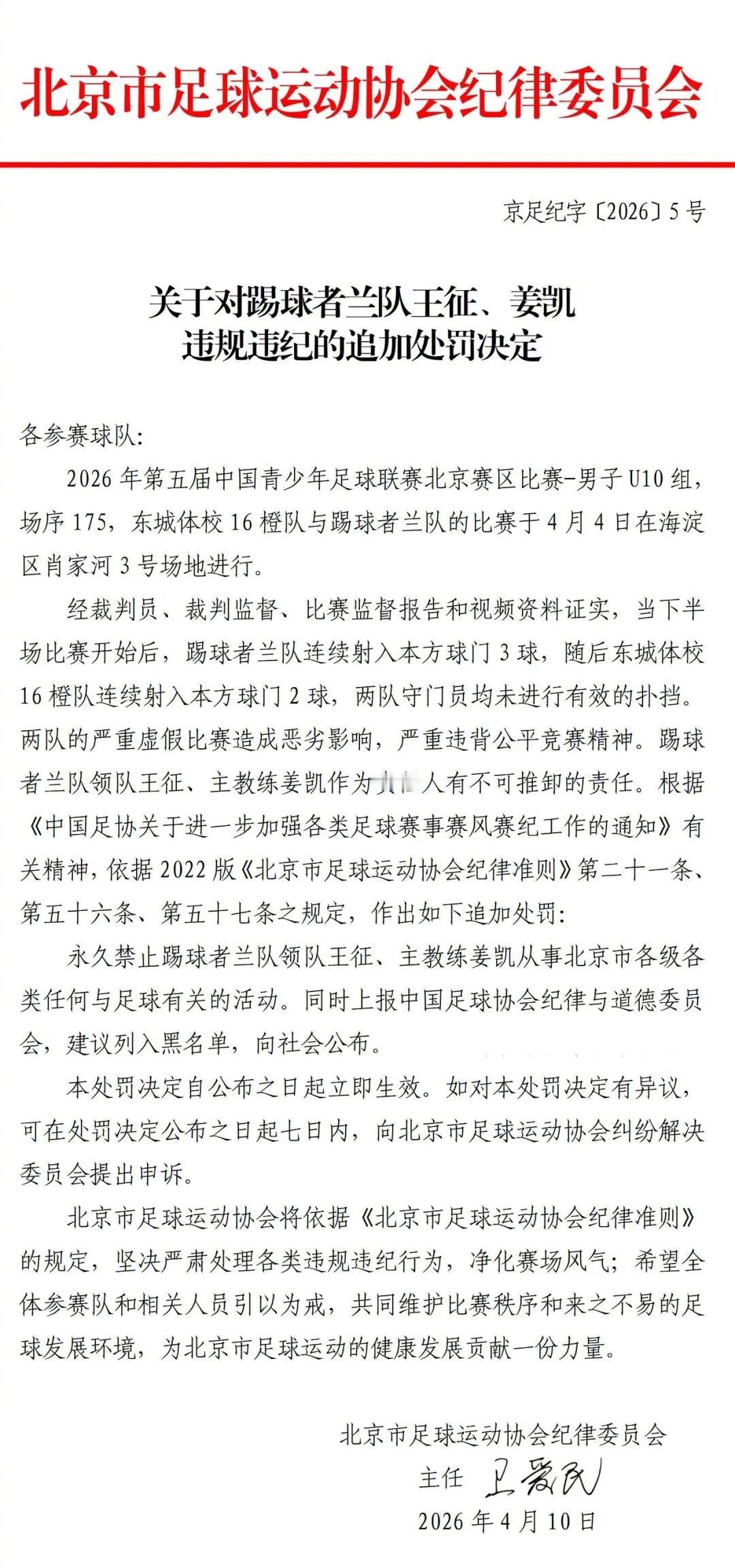北京足协对中青赛U10假球涉及的两支球队的主教练和领队做出追加处罚,两队教练及领