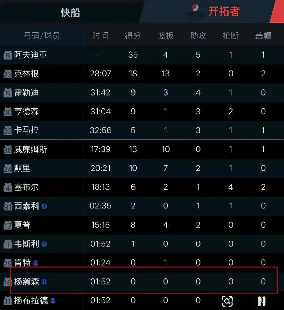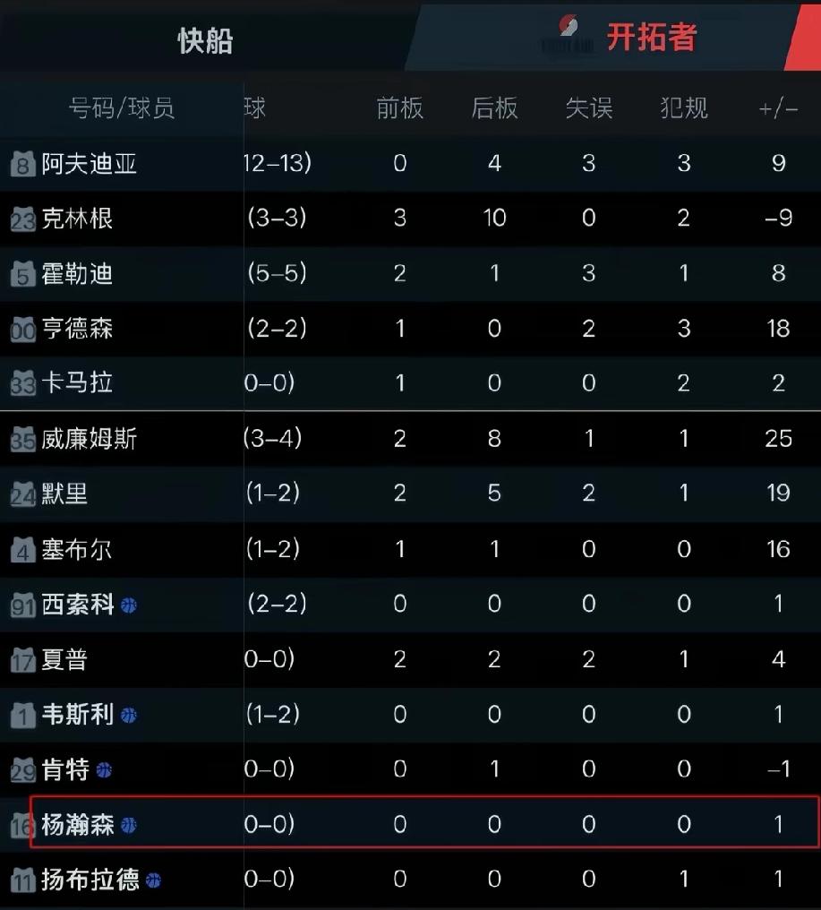 尽管,今天小杨只在垃圾时间上场2分钟,全部数据挂零,但正负值却为+1,也是做出贡献的。
