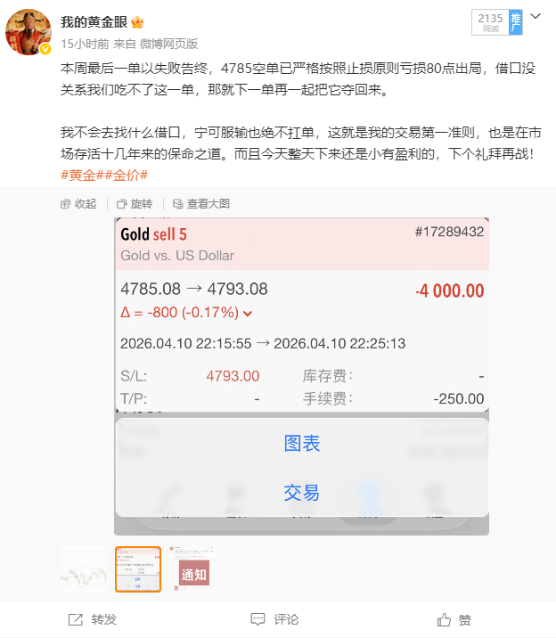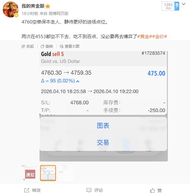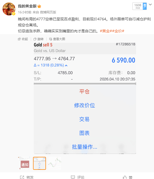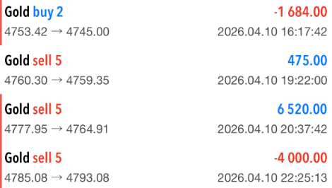 总结:4月10日共做四单,两胜两负。 总损: 30点。 4752多单4745止损离场,亏损80点 4760空单4759保本离场,小盈不计 4777空单4764止盈离场,拿下130点 4785空单4793止损离场,亏损80点不用你猜点位,不用你赌行情,照着就能直接跟,我的策略都是百分百可落地。论点数我亏30点,但由于并非每单都是同样仓位,所以算下来我还有1000余美刀的盈利,这就是盈亏比。我做不到百分百胜率的神话,只做真实透明的交易。跟单三原则:严格止损、不扛单、不重仓。能稳稳落袋的利润,才是真正属于你的钱。黄金金价