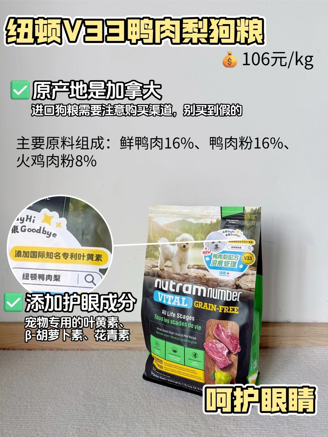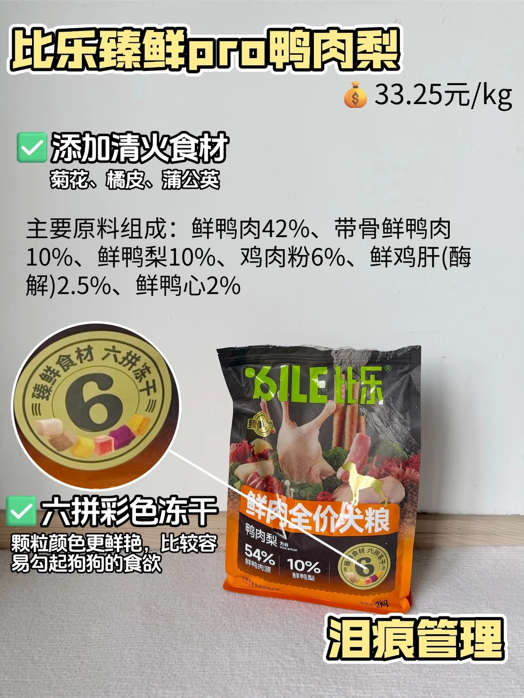 这个狗粮的颗粒是彩色的,能勾起狗狗的食欲,经典的鸭肉梨配方,对淡化泪痕特别有帮助。