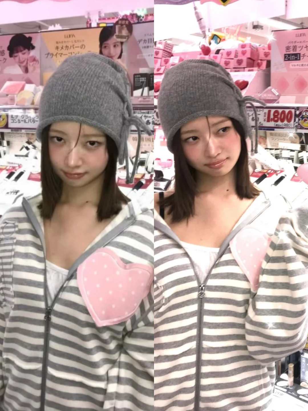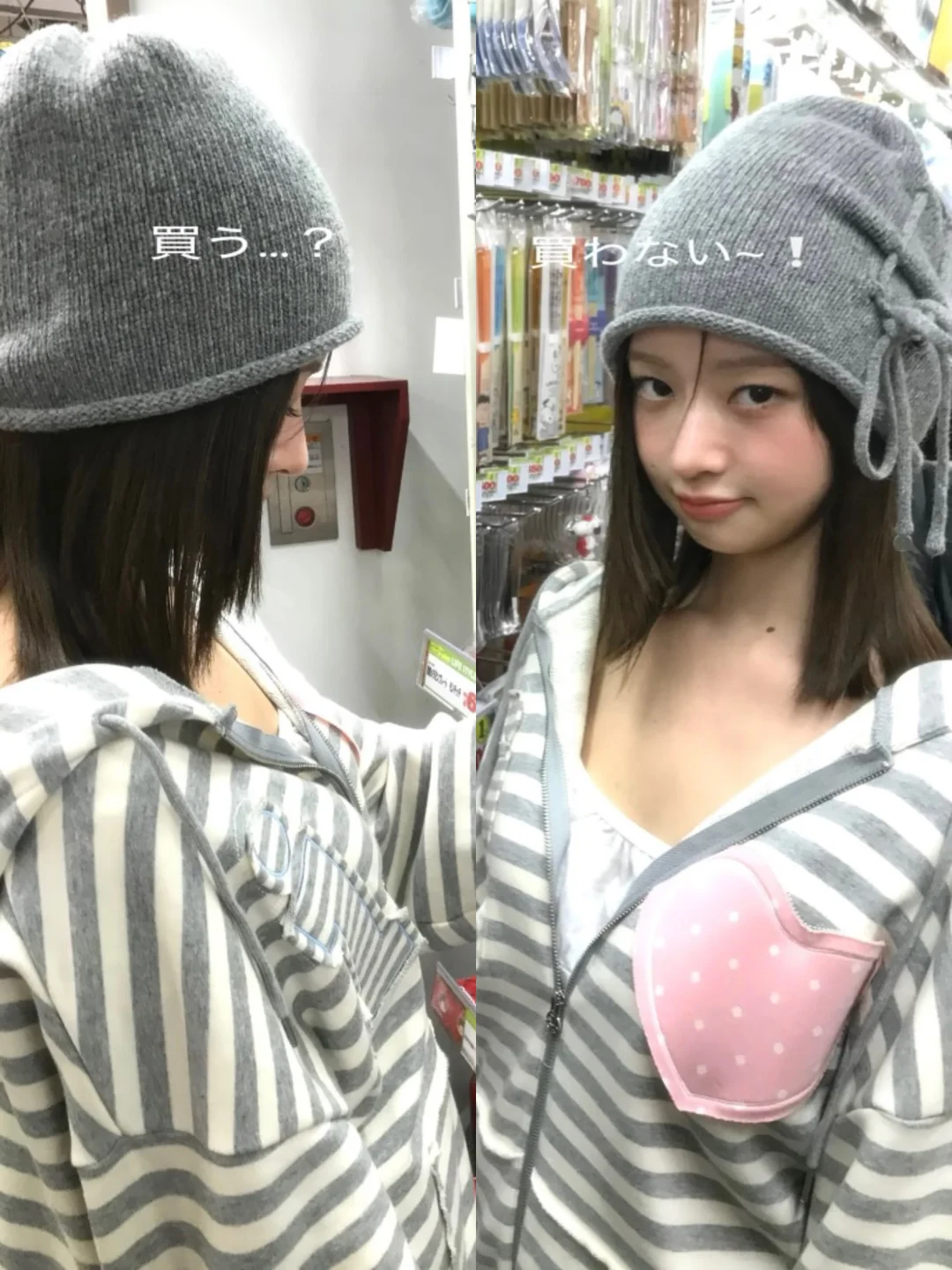 灰白条连帽开衫+针织冷帽,把韩系慵懒感焊在身上