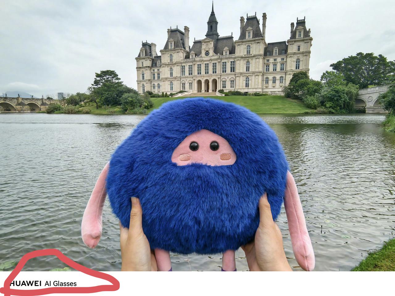 从何刚所展示的华为AI Glasses所拍摄的样张效果来看,色彩与还原一点都不输手机甚至专业相机,蓝色毛绒玩偶的毛发质感还原度极高,既有毛绒的蓬松感,蓝色又纯正不发灰;背景的华为东莞松山湖基地,湖水绿草和城堡石材,色彩层次分明,没有出现廉价数码的“噪点”或“塑料感”。这说明镜头传感器素质不错,在日常光线充足的环境下,能很好地还原真实色彩,对于“随拍”场景来说,合格且优秀。
