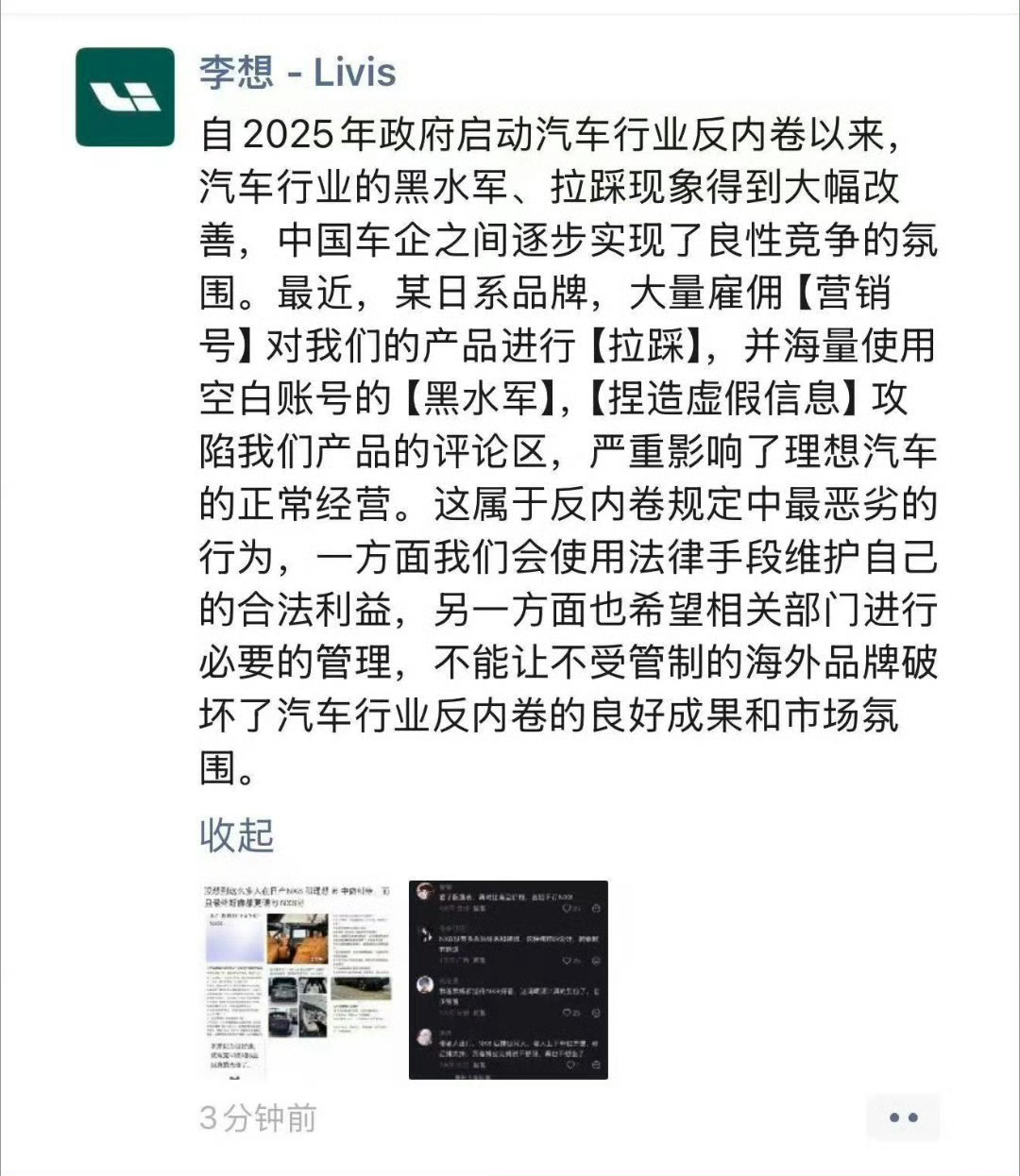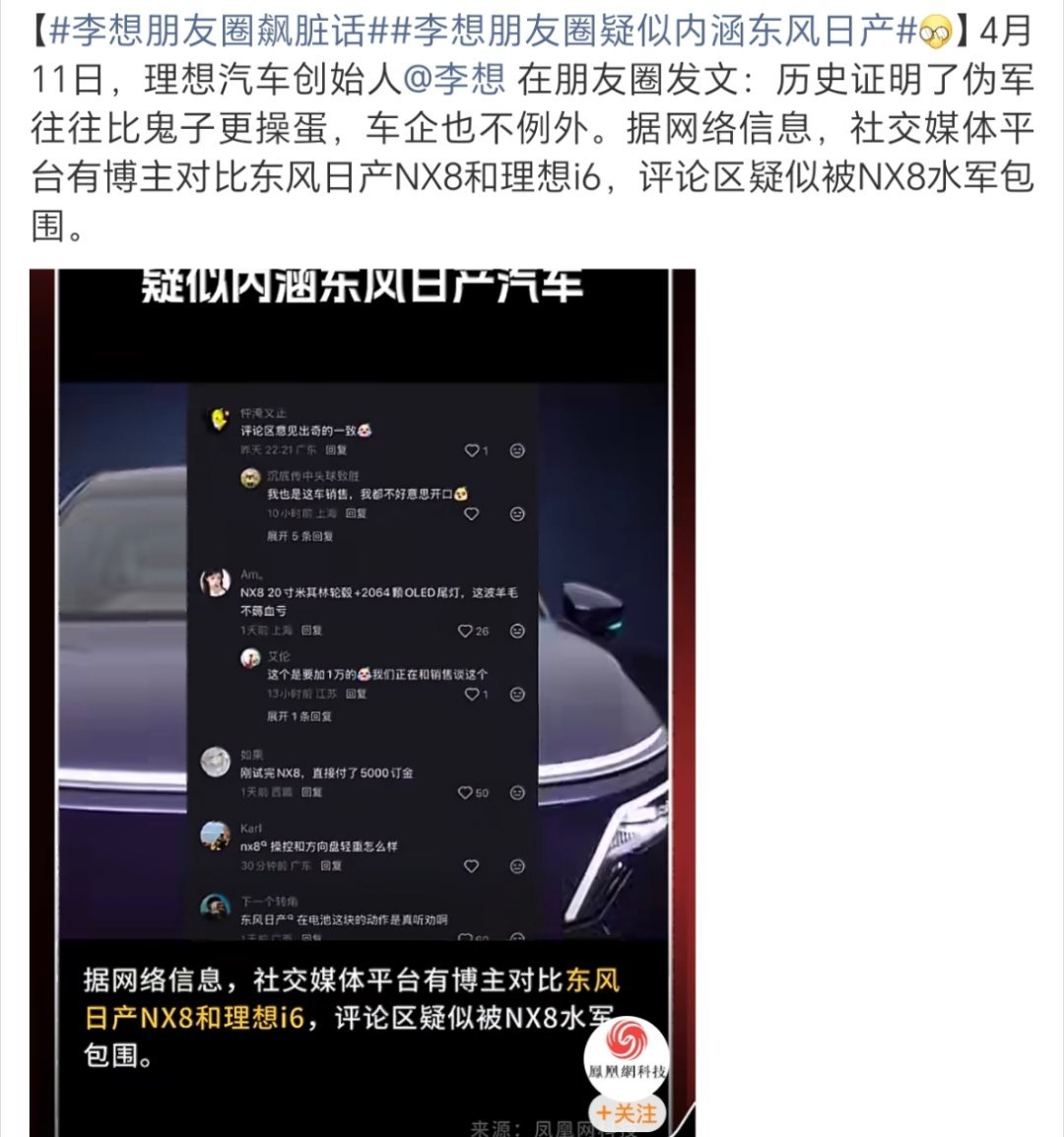 刷到李想针对水军拉踩的发声,完全能理解。反内卷政策推行后,行业本应回归产品力竞争,但对比理想i6与东风日产NX8的内容下,评论区被大量水军刷屏、控评造谣,本质是违反合规要求的恶性竞争。