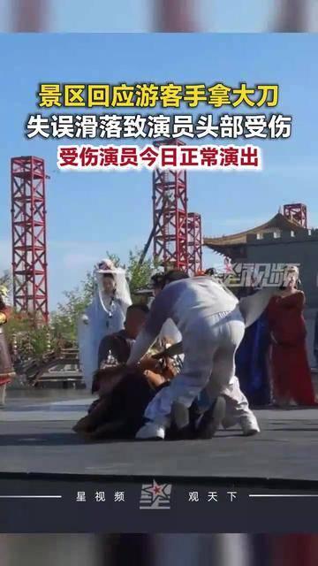 4月10日,河南开封清明上河园,一名饰演“金将军”的演员在与游客互动时,游客手中的道具大刀意外滑落,砸中演员头部致其受伤。景区回应称,受伤演员已于11日正常演出。演员本人表示,游客是误伤,所幸没有伤到游客,自己已去打了破伤风针。