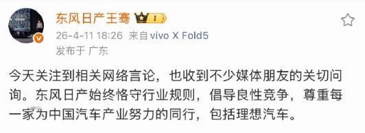 随后,东风日产新能源品牌王骞发博表示:尊重每一家为中国汽车产业努力的同行,包括理想汽车。