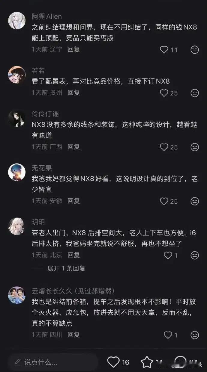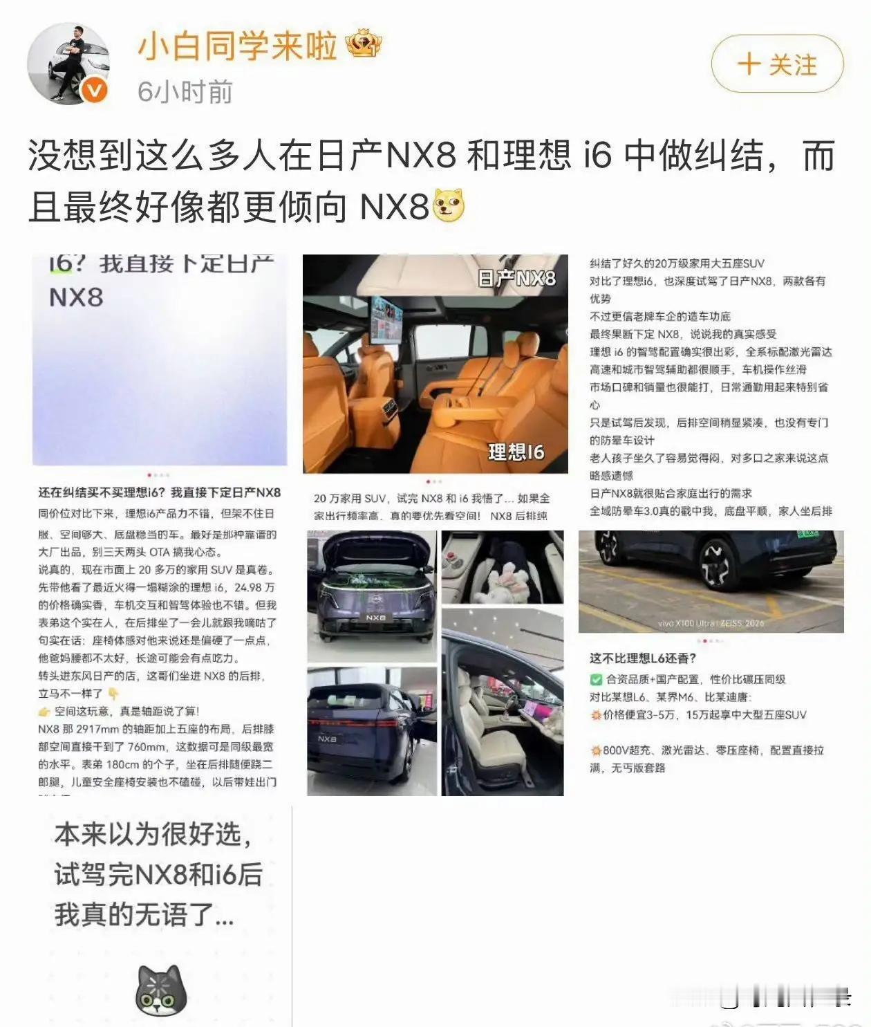 - 统一话术:狂吹 NX8“价格低、空间大”,贬低 i6“座椅硬、性价比低”
