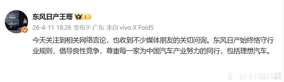 东风日产高管回应李想朋友圈吐槽 发微博称:今天关注到相关网络言论,也收到不少媒体朋友的关切问询。东风日产始终恪守行业规则,倡导良性竞争,尊重每一家为中国汽车产业努力的同行,包括理想汽车。 东风日产高管回应李想言论
