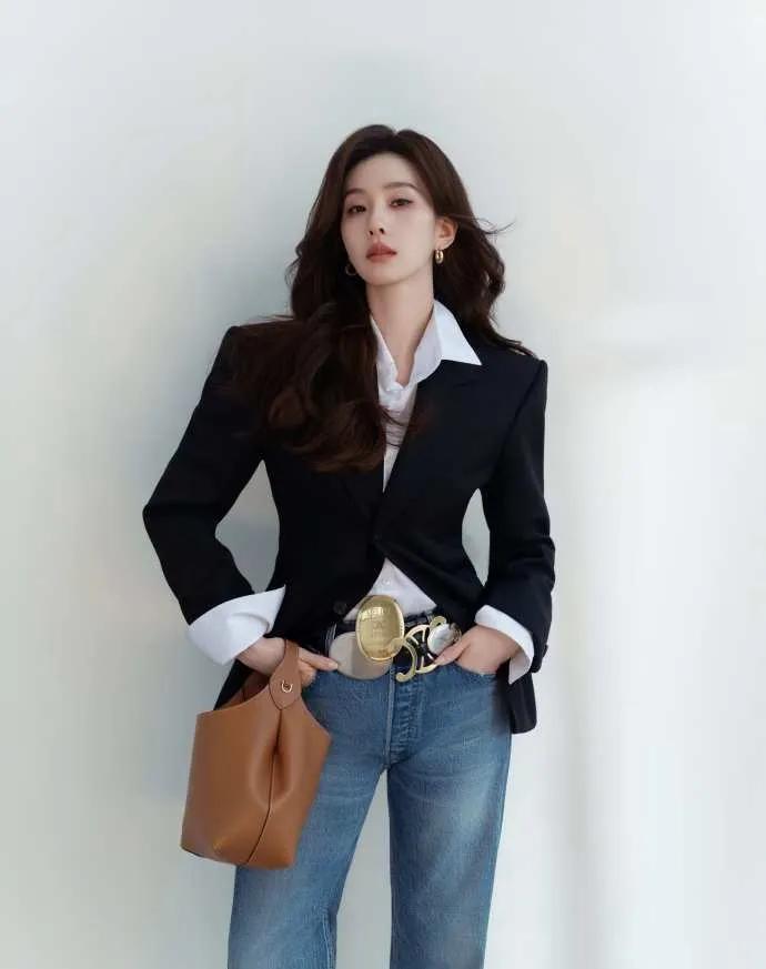刘诗诗状态绝了!39岁气场全开! 黑西装+白衬衫+牛仔裤,飒爽高级, 金扣腰带是