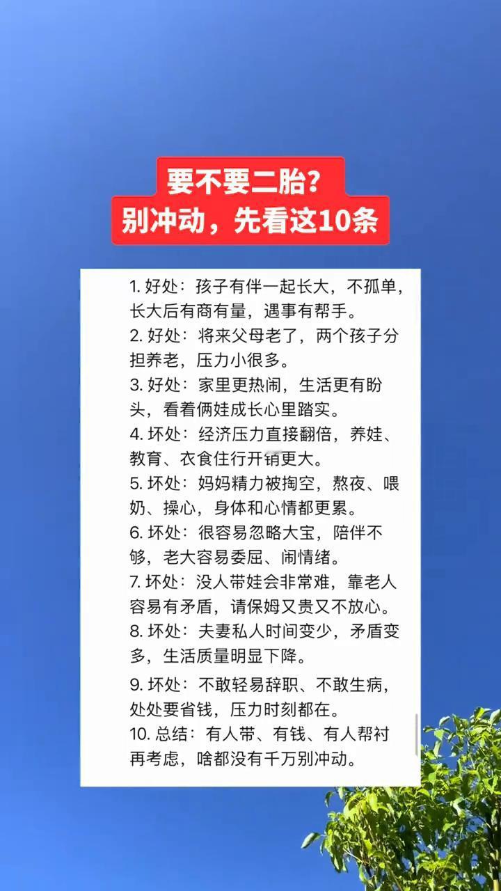 要不要二胎?别冲动,先看这10条。 ·1.好处:孩子有伴一起长大,不孤单,长大后