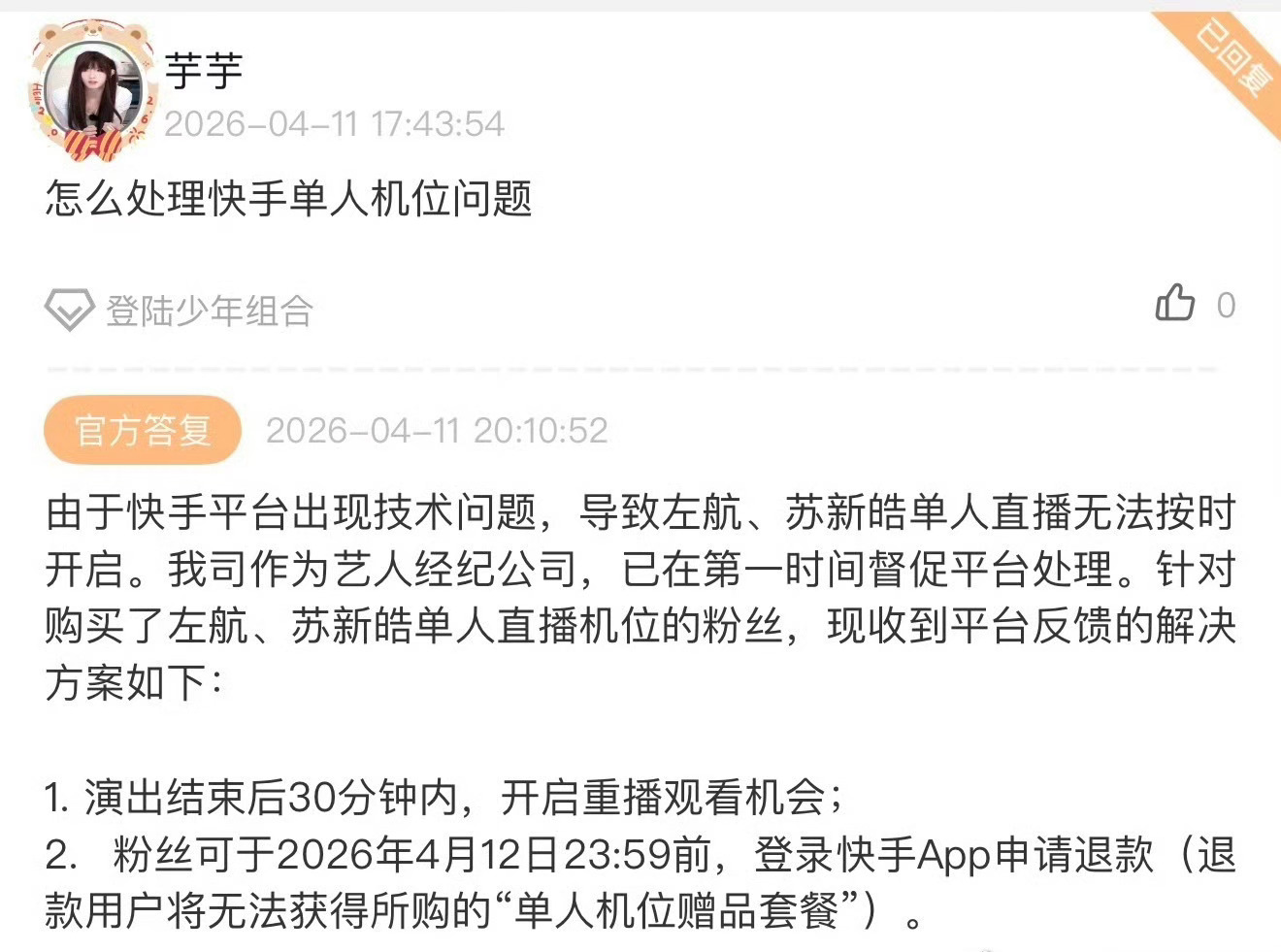 快手道歉,时代峰峻也回应了。可以退款快手向左航苏新皓道歉