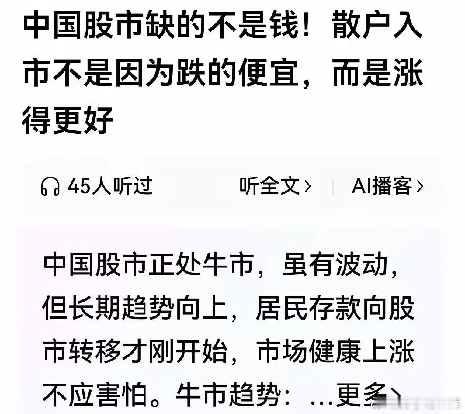刘纪鹏说得好:股市不缺钱,散户入市不是因跌得便宜,而是涨得更好。