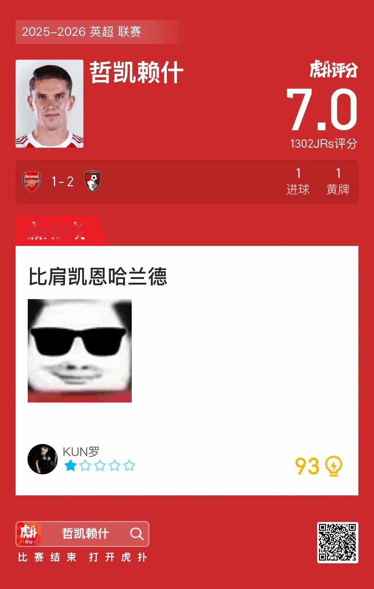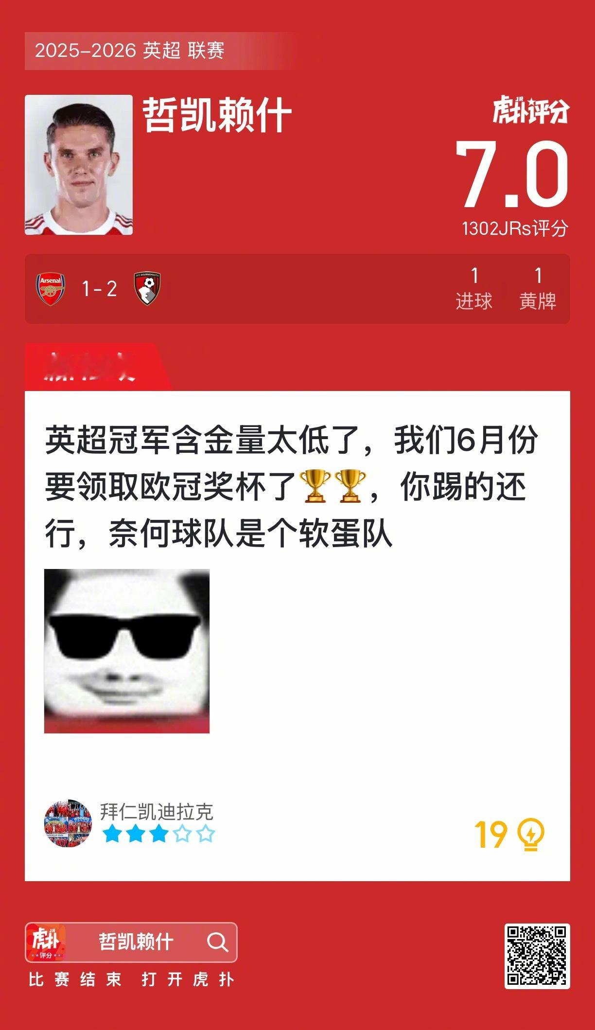 阿森纳1比2伯恩茅斯哲凯赖什打进一球,这表现你给几分?