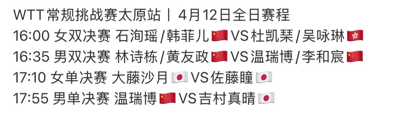 女双决赛是石洵瑶/韩菲儿对阵香港队的杜凯琹和吴咏琳,国乒女队加油!