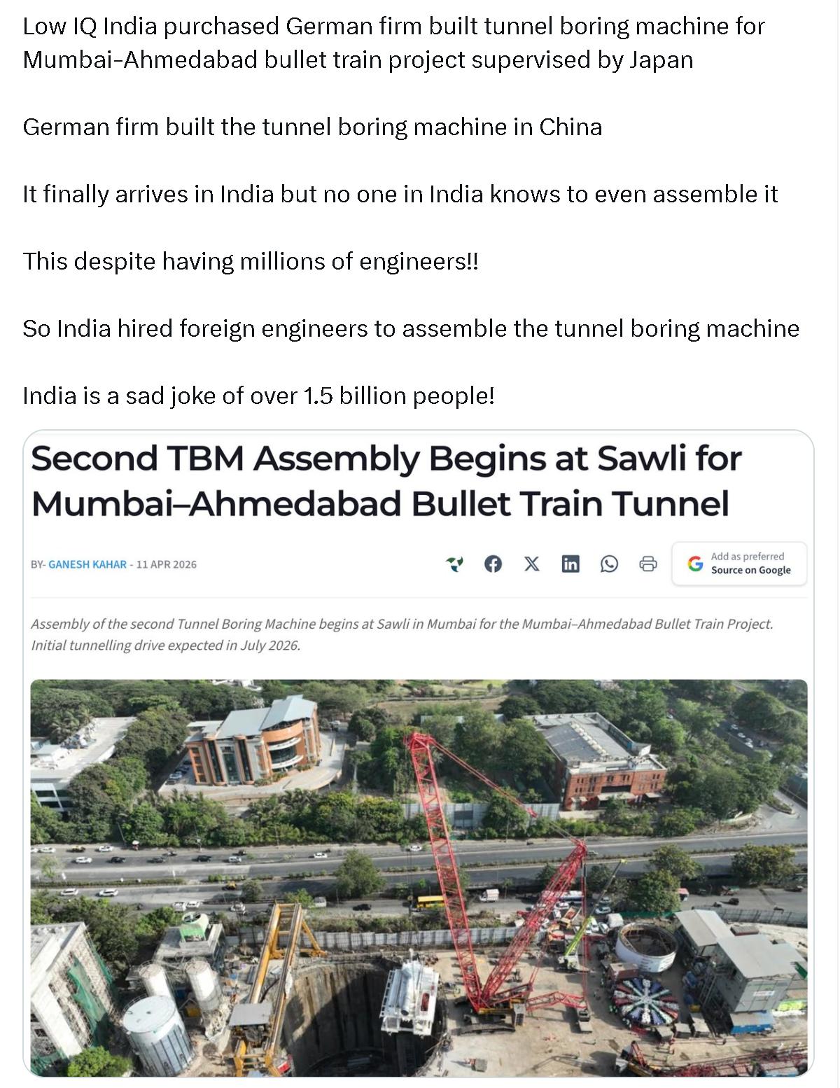外媒:低智商印度购买了德国公司建造的隧道掘进机,用于孟买-艾哈迈达巴德高铁项目,该项目由日本监督德国公司在中国建造了隧道掘进机。它终于到了印度,但印度没有人知道如何组装,尽管印度有数百万工程师!!