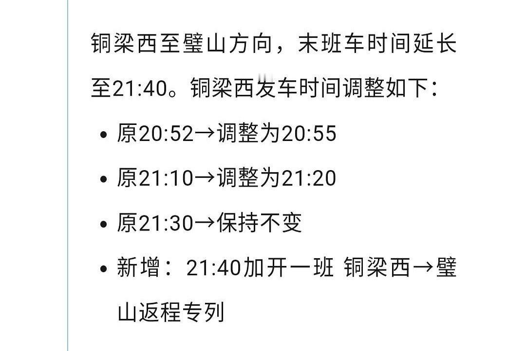 璧铜线,末班车直接给你延到晚上九点四十,还加开一趟专列。江跳线更狠,连开三趟专列,最晚一班直接干到深夜十一点过五分,直通江津家门口。