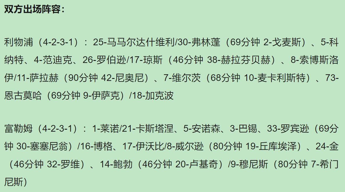 要我说,这2-0是止痛片,也是警钟。药效过了,疼还得接着来。但您看见没?17岁的肩膀,已经能扛事儿了。至于富勒姆,踢得热闹最后一脚差口气——中游球队和争冠队的差距,就在这“一口气”上。咱现在得感谢这口气,但下回,咱得靠自己的脊梁骨把这口气顶上去,而不是靠门神开挂。英超-利物浦2-0富勒姆止三连败
