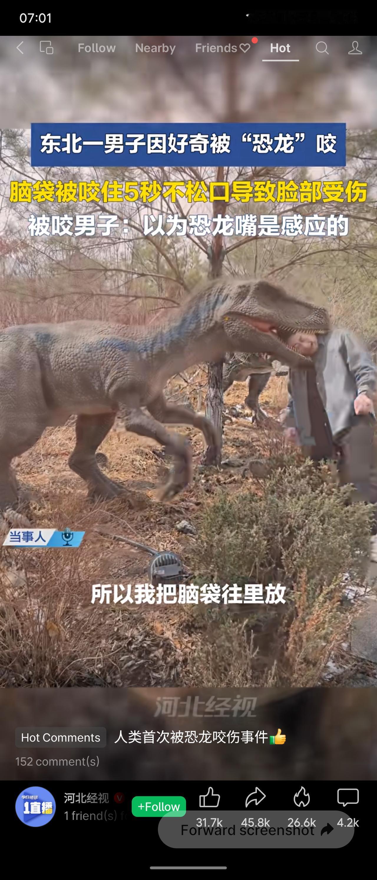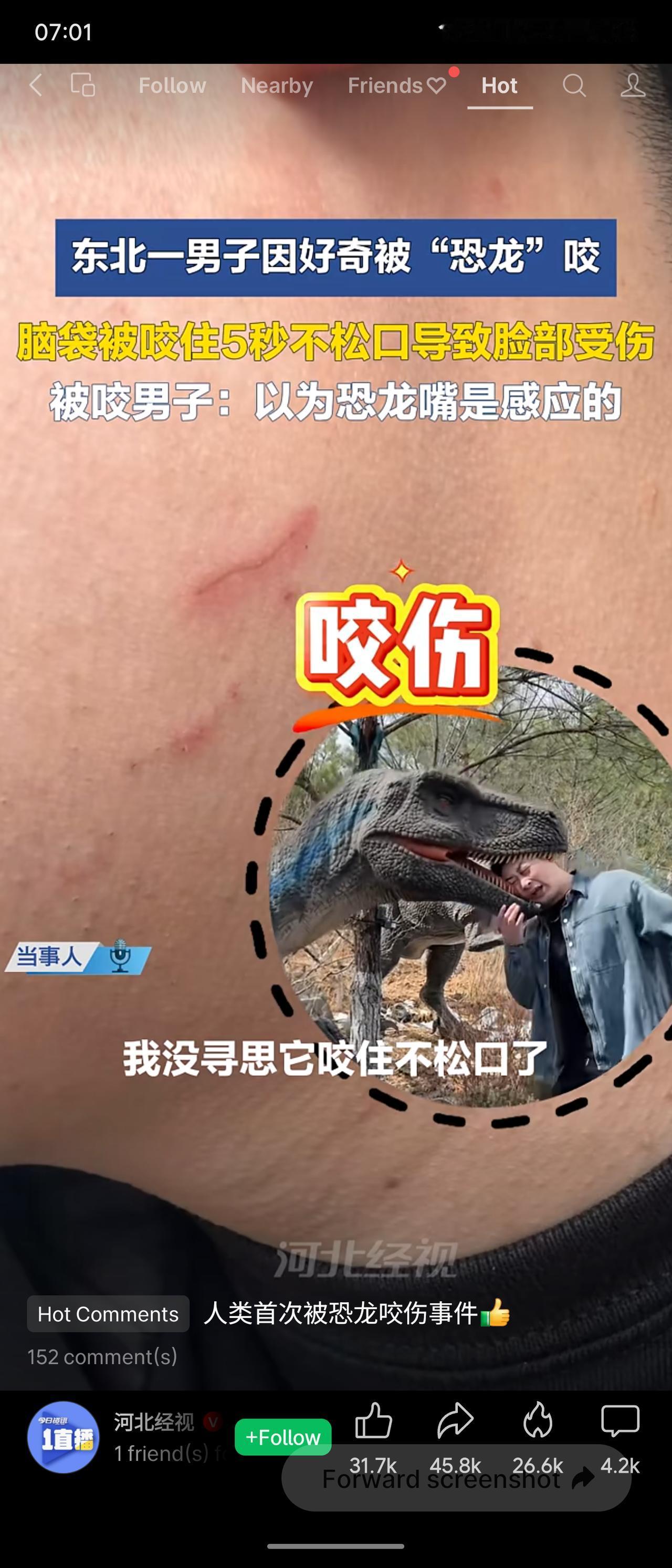 东北一男子好奇把脑袋伸进恐龙模型嘴里,以为感应式会自动松开,结果被死死咬住5秒,导致脸部受伤。当事人懊恼:“没寻思它不松口啊!”网友调侃:人类首次被“恐龙”咬伤事件。