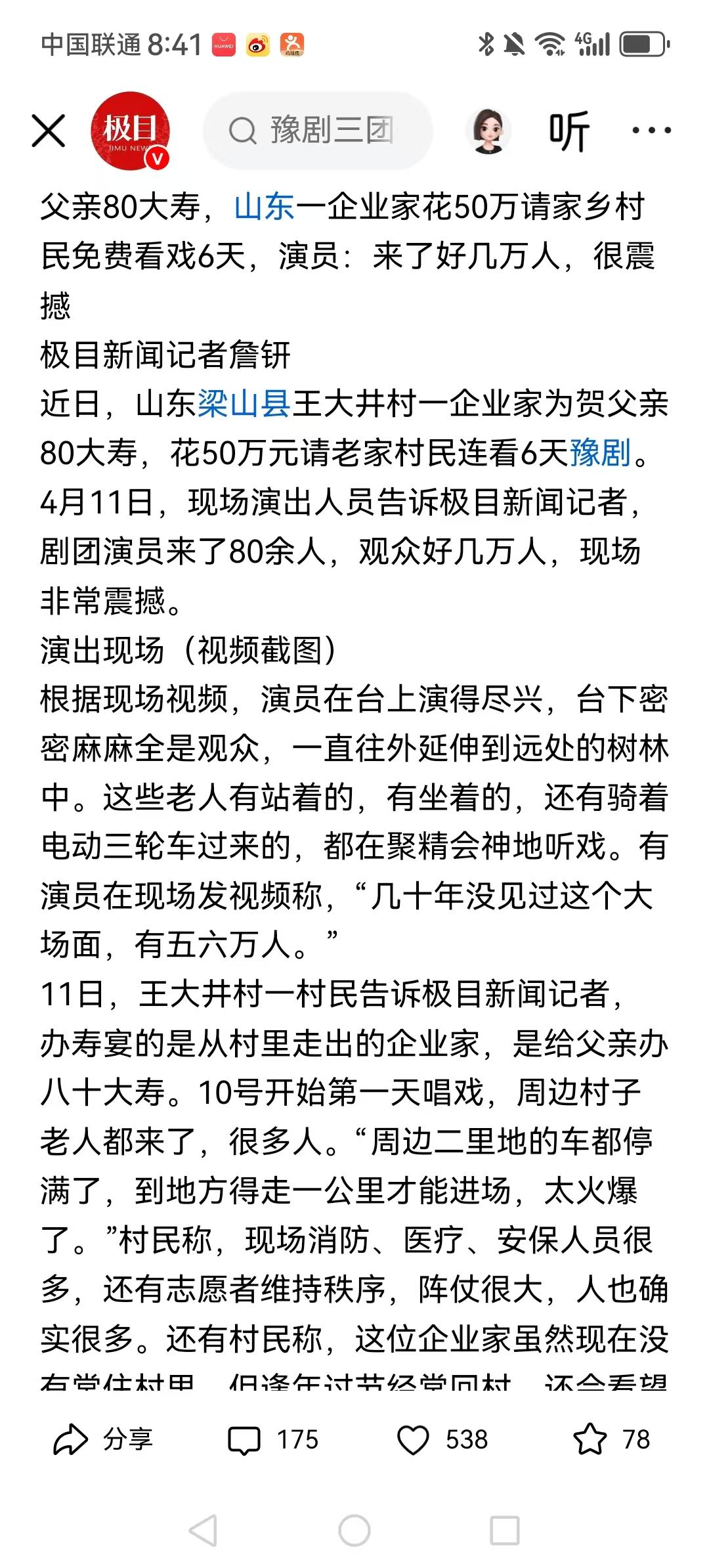 父亲80大寿,山东一企业家花50万请家乡村民免费看戏6天,这钱花的值,比埋奔驰好的多。