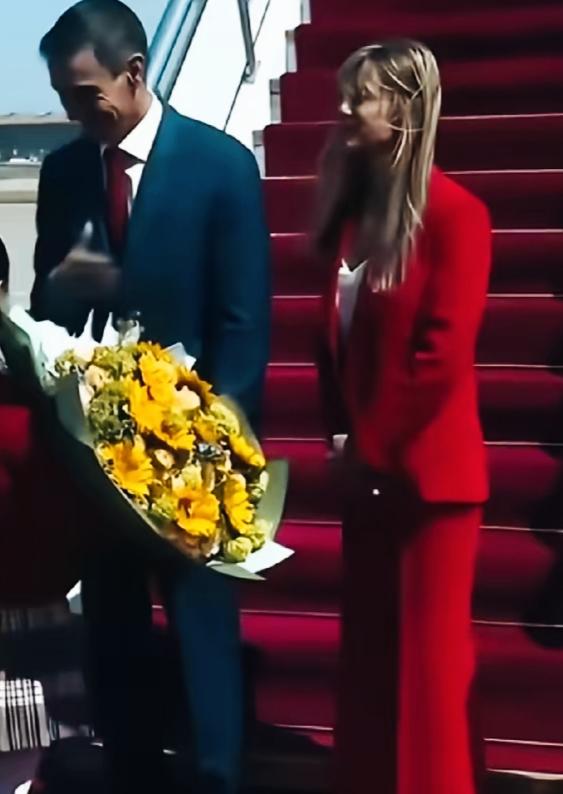 西班牙首相桑切斯夫人一身大红色,一看就对这次的访问非常重视啊! 桑切斯夫人一身简