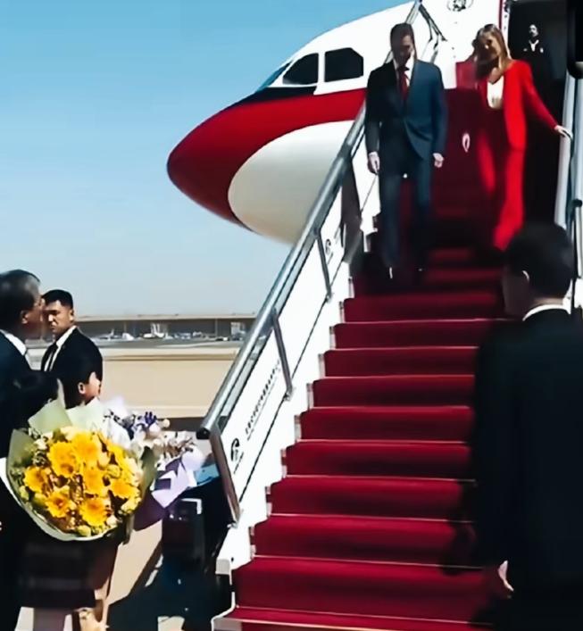 西班牙首相桑切斯夫人一身大红色,一看就对这次的访问非常重视啊!