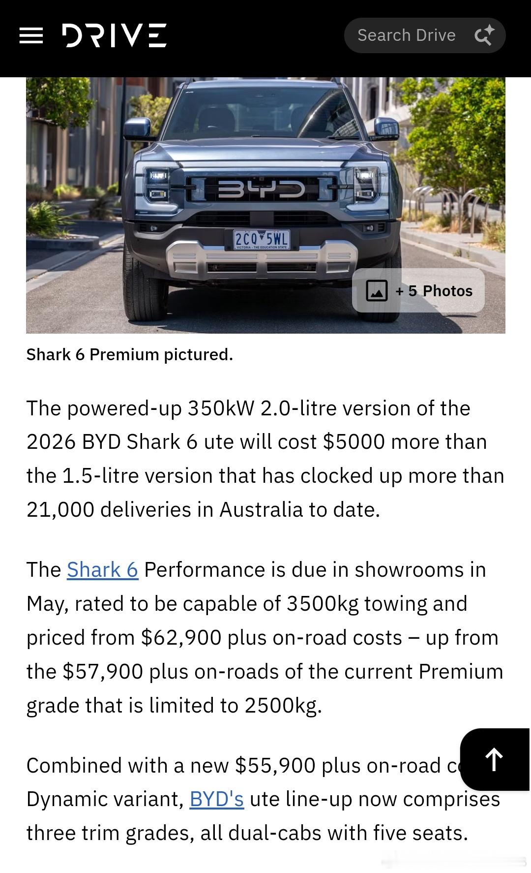 国内鲨鱼资质刚拿到,澳大利亚那边都已经上2.0版本了,ute版,3500kg牵引力,比现有顶配贵了5000美元。目前澳大利亚的shark6,不含上路费,最低30万起,中配40,ute差不多快45万人民币了。话说鲨鱼后面进了国内,大家觉得定价会是多少?大v聊车比亚迪