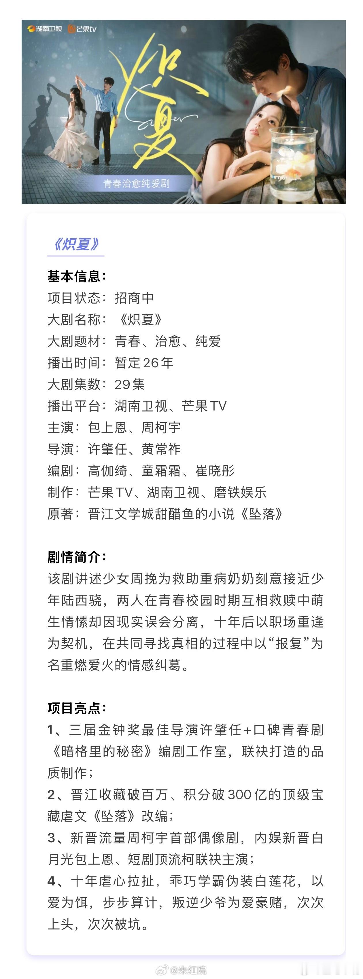 炽夏包上恩、周柯宇《炽夏》已开始招商,预计6月中旬湖南卫视、芒果TV开播。敬请期待!