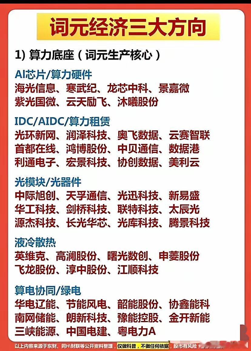 词元经济,是AI时代下一条全新价值主线,整条赛道清晰划分为三大核心方向:算力底座词元生成的硬核根基,涵盖AI芯片、IDC、光模块、服务器等核心硬件,是产业链最刚需的底层支撑。调度与传输词元高效流通的“高速路网”,包含算力调度、CDN、算力网络等关键环节,打通供需、提升效率。应用与数据词元价值落地的终端场景,聚焦大模型、数据要素、垂直行业应用,直接对应商业化变现。看懂这三大方向,就能精准把握词元经济的核心机会🚀觉得有用的朋友,评论区扣666,一起抓主线!