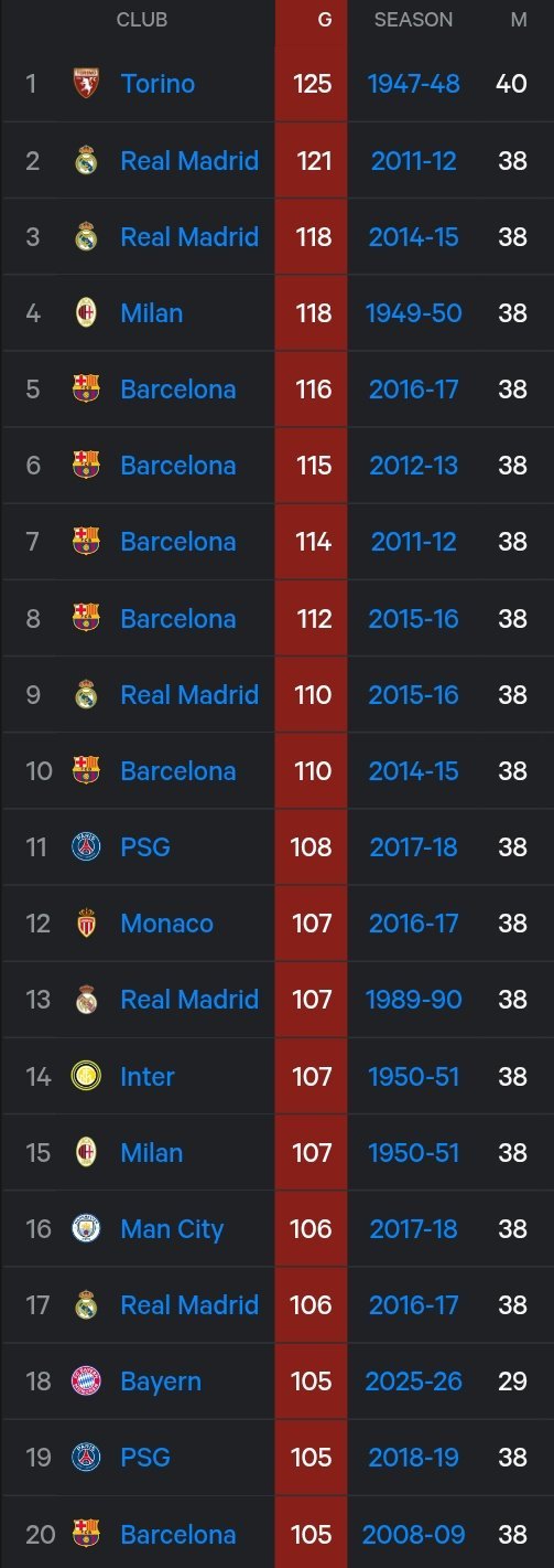 拜仁打破德甲单赛季进球纪录,105球在五大联赛历史上排名第18,历史第一是47/48赛季都灵队的125球,当时意甲40轮。拜仁还剩下5轮联赛冲击都灵的纪录: