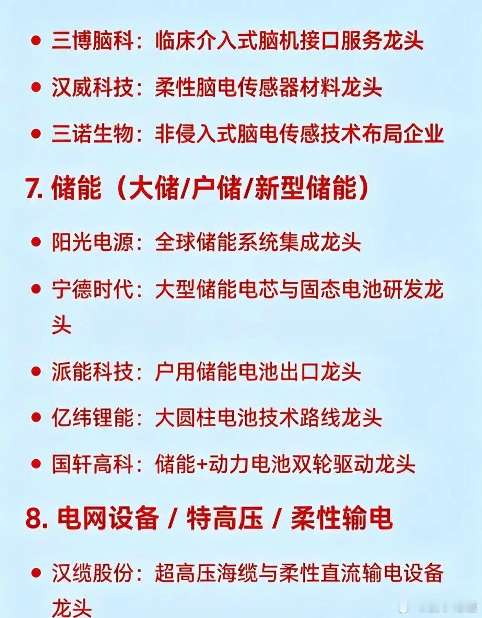 7. 储能(大储/户储/新型储能)龙头阳光电源:全球储能系统集成宁德时代:大型储能电芯与固态电池研发派能科技:户用储能电池出口亿纬锂能:大圆柱电池技术路线国轩高科:储能+动力电池双轮驱动