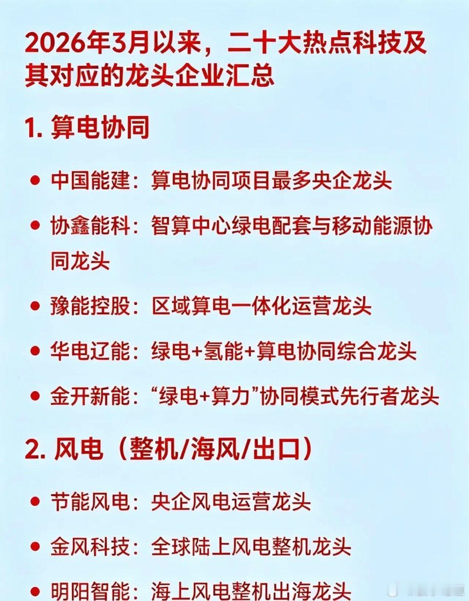 2026年3月以来,二十大热点科技及其对应龙头企业汇总1. 算电协同龙头中国能建:算电协同项目最多的央企协鑫能科:智算中心绿电配套与移动能源协同豫能控股:区域算电一体化运营华电辽能:绿电+氢能+算电协同综合金开新能:“绿电+算力”协同模式先行者
