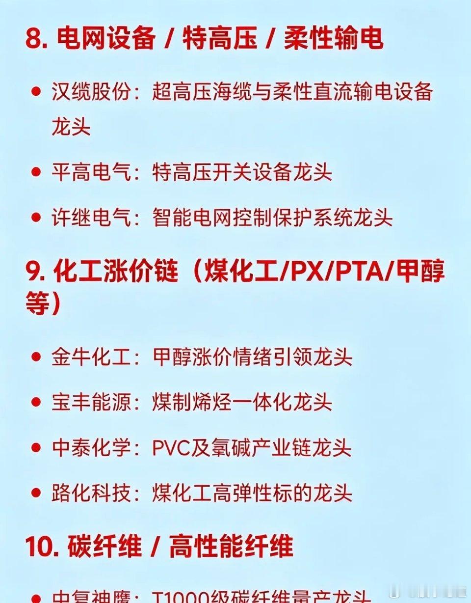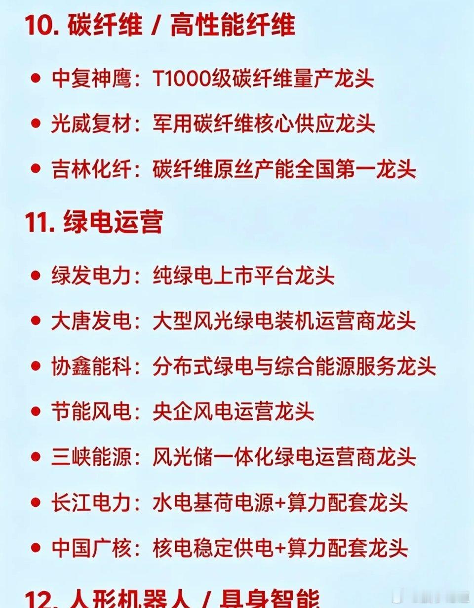 10. 碳纤维 / 高性能纤维龙头中复神鹰:T1000级碳纤维量产光威复材:军用碳纤维核心供应吉林化纤:碳纤维原丝产能全国第一