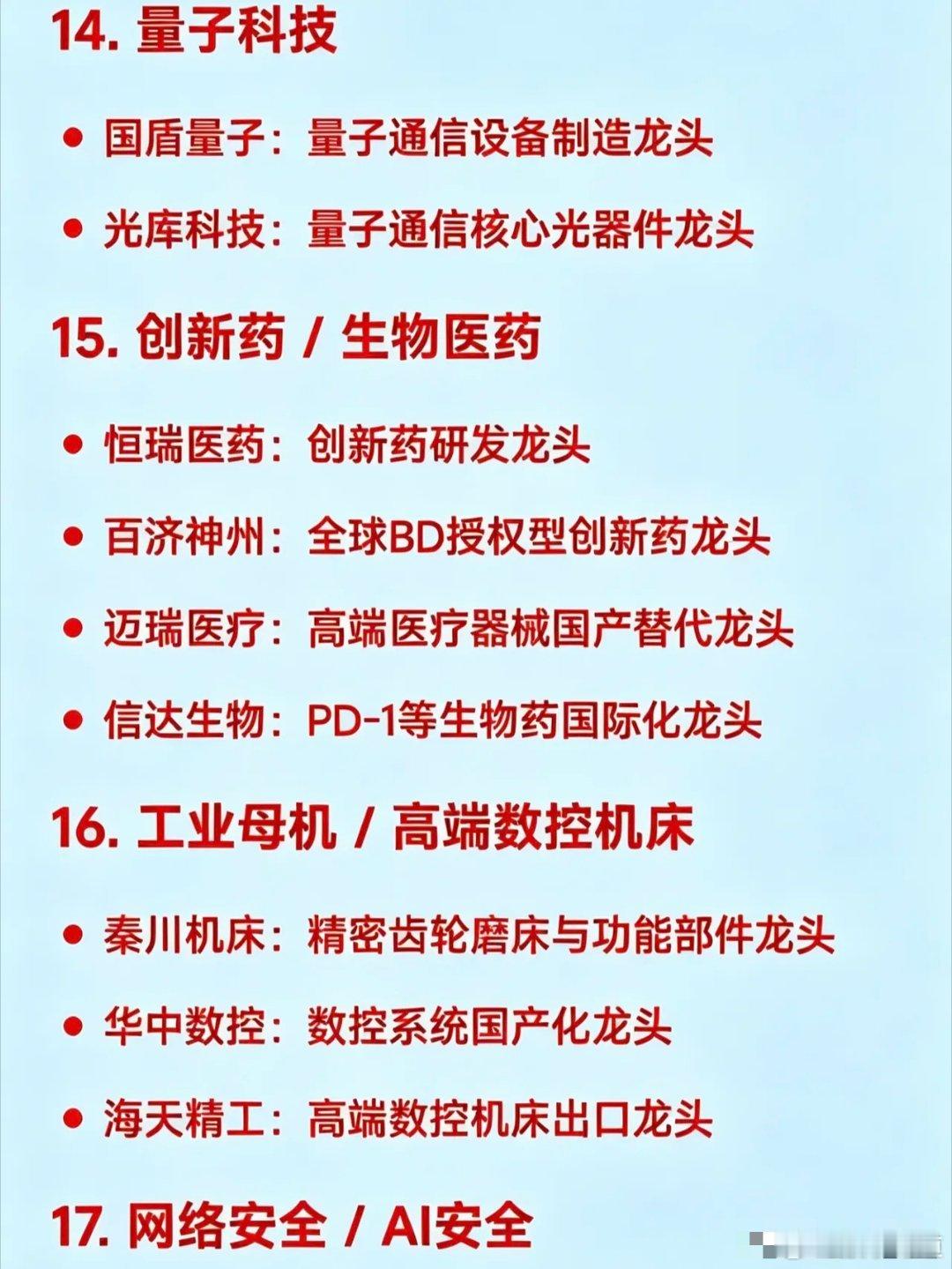 15. 创新药 / 生物医药龙头恒瑞医药:创新药研发百济神州:全球BD授权型创新药迈瑞医疗:高端医疗器械国产替代信达生物:PD-1等生物药国际化